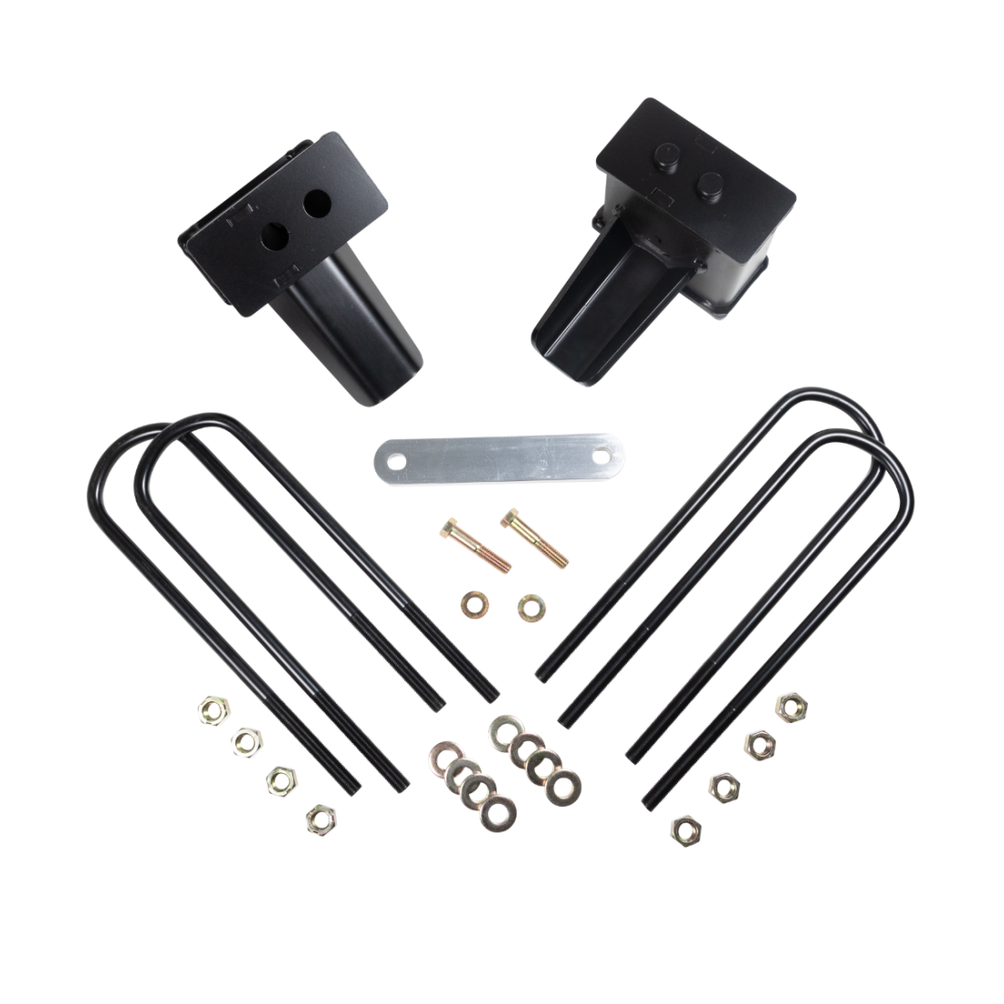 ReadyLIFT's Ford F-150 OEM style 4" Rear Block Kits are now available for 2021-2023 Ford F150 2WD/4WD applications. These Rear Block Kits include two (2) 4" Tall Rear Blocks, four (4) E-Coated U-Bolts, eight (8) Nuts and Washers and will safely lift the rear of your 2021-2023 Ford F-150 Truck. Create more rake with the addition of this 4" tall rear block kit. Ideal for when more rear lift is required for towing or hauling. Based on OEM designs and never made out of lightweight extrusions, our 4" Ford F-150 Blocks have Integrated OEM Style Bump Stop Landings and cast-in center pins. ReadyLIFT Block Kits will put a slight rake back in your truck for hauling or towing and are designed to work in concert with your ReadyLIFT Suspension Leveling Kit. In fact, these blocks are the ideal Tow Package upgrade for not only for stock height vehicles but lifted or leveled trucks too. Like all ReadyLIFT products, these block kits come with our Limited Lifetime Warranty. With this new Rear Lift Block, you will never have to illegally stack rear blocks again!
