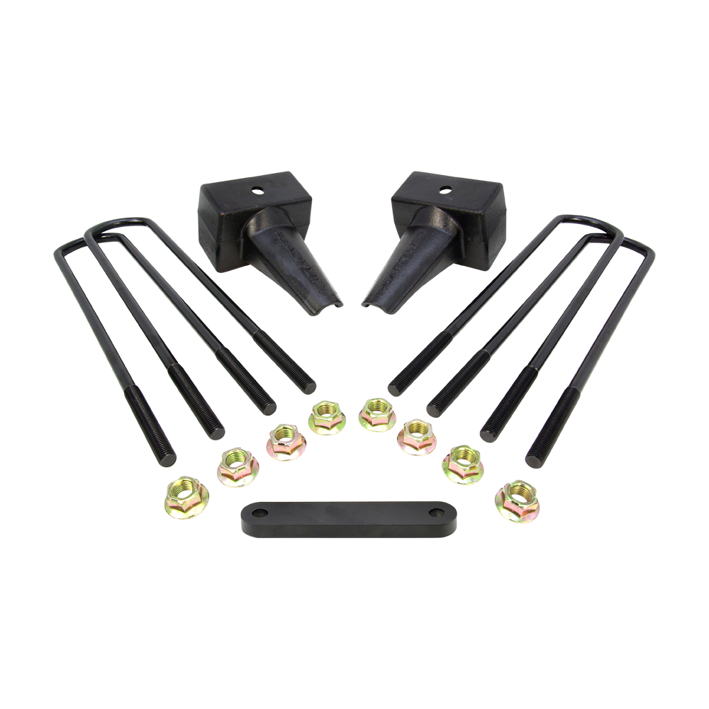 ReadyLIFT OEM-style rear block kits are available for model specific applications. These Rear Block Kits include two (2) 4" Rear Blocks, four (4) E-Coated U-Bolts, eight (8) Nuts and Washers and will safely lift the rear of your 1999-2010 Ford Super Duty 2WD/4WD Truck with a two-piece driveshaft. Based on OEM designs and never made out of light weight extrusions our 66-2294 4.0" Ford Super Duty Blocks have Integrated OEM Style Bump Stops. ReadyLIFT Block Kits will put a slight rake back in your truck for hauling or towing and are designed to work in concert with your ReadyLIFT Suspension Leveling Kit. In fact, these blocks are the ideal Tow Package upgrade for not only for stock height vehicles but lifted or leveled trucks too! Like all ReadyLIFT products, these block kits come with our Limited Lifetime Warranty. NOTE: The lift blocks in this kit are not designed to work with aftermarket or factory add-on air spring/load leveling kits that attach to the bump stop tangs. Use of this type of air bag system will void all block warranties and can cause failure of the block bump stop tang.