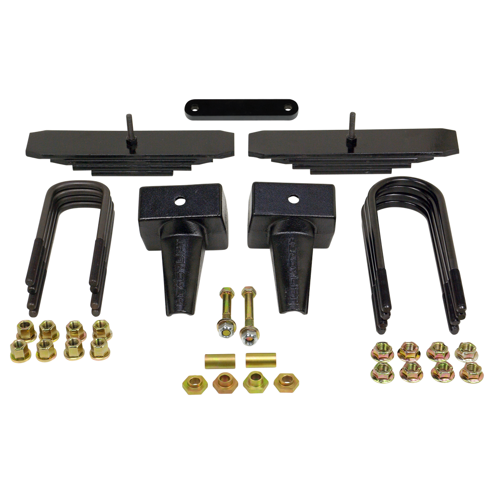 ReadyLIFT offers an expanded line of leveling products made to fit the Ford Super Duty trucks. Due to popular demand we developed a SST Lift Kit for the 1999-2004 Ford F250 Super Duty 4WD trucks and 2000-2005 Ford Excursion 4WD. (Note: for use on 1999 model F250 trucks built after 3/1/1999 – not for use on trucks built before 3/1/99). These front leaf spring trucks require an innovative approach to leveling-lifting. ReadyLIFT is proud to offer a new SST Lift Kit system that will compliment the leaf spring suspension. This system includes a "mini leaf pack" that, once installed under the factory leaf spring pack, raises the front of the F250 4WD Super Duty trucks a total of 2.0" which is what is required to obtain a level stance. To lift the rear, our time-tested OEM-style 4.0" cast iron rear blocks with built-in pinion angle correction and bump stop landings replace the factory 2.0" block for additional lift of 2.0". This kit also includes a carrier bearing spacer which is intended for use on trucks with a two-piece drive shaft. This set up establishes a mild lift with a slight rake maintained for towing or hauling. The kit comes with new longer front and rear U-bolts and hardware as well as important pan-hard bar alignment bushings. This kit will allow for up to 35" tall tires. If you are looking for a leveling kit for your (post 3/1/99) '99-04 F250 then look no further. This is the kit you've been searching for. Fits trucks fit with either the gas or diesel engine applications. NOTE: For trucks with a two-piece drive shaft. NOTE: The lift blocks in this kit are not designed to work with aftermarket or factory add-on air spring/load leveling kits that attach to the bump stop tangs. Use of this type of air bag system will void all block warranties and can cause failure of the block bump stop tang.