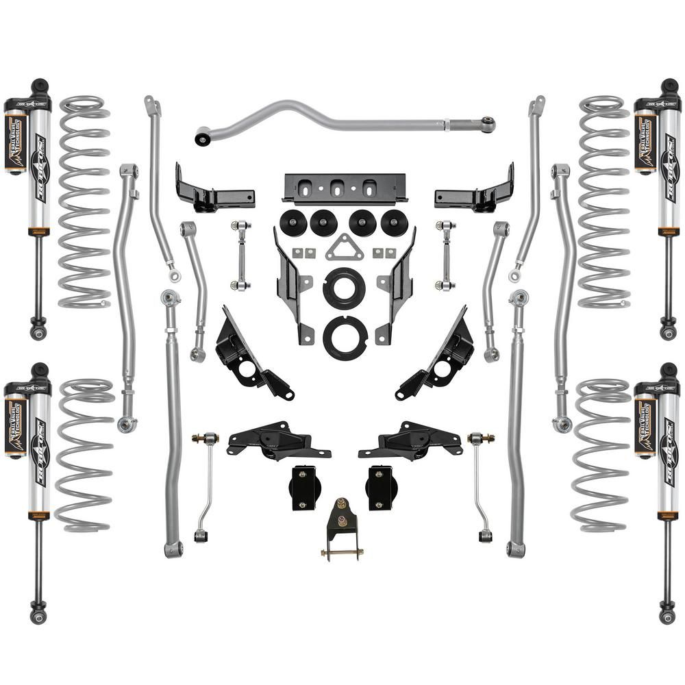 The latest addition to the Rubicon Express JL suspension offering is our complete 4-LINK Extreme-Duty Long Arm system. These high performance suspension systems deliver both performance and control that are unmatched by any other long arm kit on the market. They feature adjustable Chromoly upper and lower control arms that will stand up to anything you can drive over. w. PT-MEG Super-Ride Bushings and Super-Flex Joints they are sure to provide superior handing while not limiting articulation. The kits FULL WIDTH heavy-duty transmission crossmember allows for more durability and frame rigidity then the competition. This also allows for installation that is much easier that competitors kits eliminating the need for welding. An optional robust belly pan, and CNC machine steering knuckle provide outstanding upgrades. Coil spring rates are perfectly tuned for bump compliance and load handling and are complemented by 2.5" diameter position sensitive piggyback Resi. shocks. These shocks are precisely tuned by Rubicon Express to maximize all terrain comfort, overall driver control and stability. Like all Rubicon Express systems, they are made in the USA and backed by the Rubicon Express Advantage Lifetime Warranty.