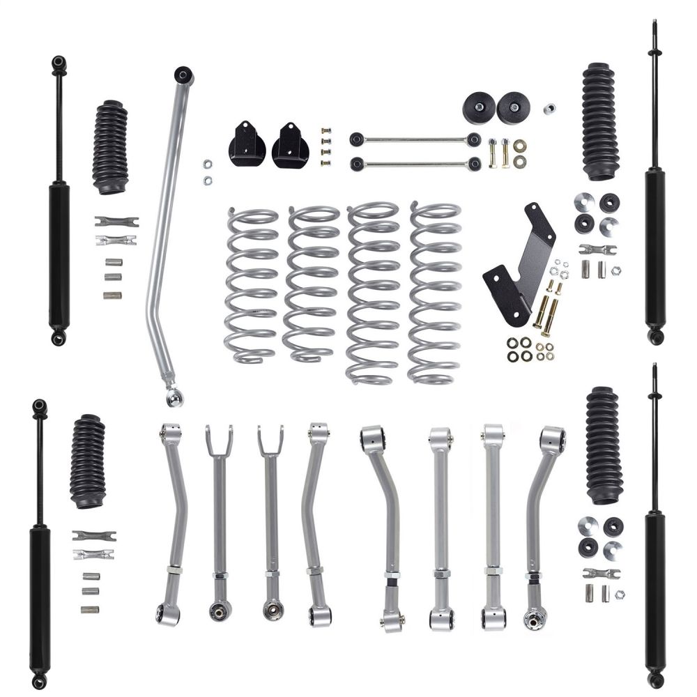 2.5 in. Lift Height 4-Door Models; Standard Coils Super-Flex Adjustable Upper And Lower Control Arms Bump Stops; Rear Track Bar Bracket Extended Sway Bar End Links Includes Twin Tube Shocks; Easily Upgradeable