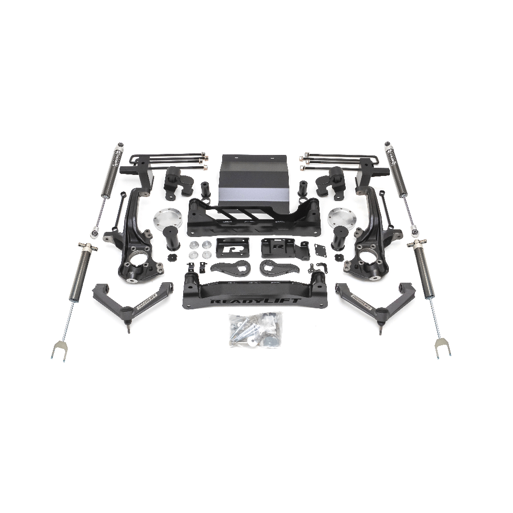 Features & Benefits: Laser cut, CNC formed heavy-duty front/rear drop crossmembers. Bolt-on installation well almost. Some slight modifications will be required. OE-style cast iron knuckles have been precisely engineered to provide the ideal geometry to ensure proper alignment and improve the overall driving experience. Increases ground clearance. Includes our new torsion bar relocation brackets that keep the torsion bars in their factory location no need to lower the torsion bars to lift! 6 lift kits – Allows for 37×12.50 on a 9" wide wheel with zero offset. Available with ReadyLIFT Falcon 1.1 Monotube F/R shocks. Includes important differential drop brackets and CNC-machined billet Aluminum CV axle spacers. NOTE: Some GM HD trucks equipped with Tow Package may require custom-length U-bolts purchased separately. Custom U-bolt length may vary by vehicle application. If the ReadyLIFT kit's standard U-bolts are too short, ReadyLIFT recommends locally sourcing custom U-bolts built to each truck's specifications.