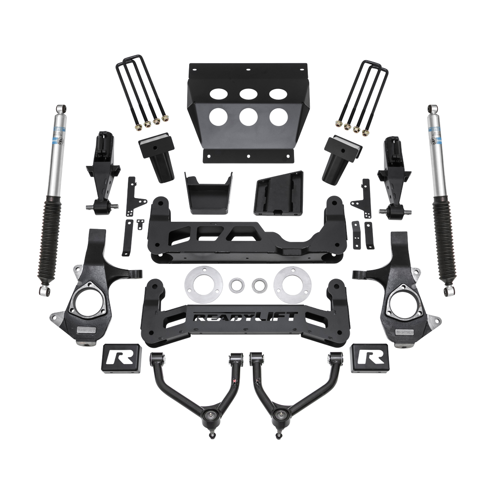 ReadyLIFT is excited to introduce a 7-inch big lift kit designed for 2014-2018 Chevy Silverado and GMC Sierra 1500 trucks, compatible with or without MagneRide. The 44-3472 lift kit is tailored for use on 2014-UP GM 1500 trucks with factory Stamped Steel front suspension, featuring new tubular upper control arms. Key features of this kit include retaining the factory turning radius while minimizing track width increase to less than 0.5" per side, accommodating up to a 35" tall tire on a 9-inch wide wheel with -12 offset. The kit utilizes a "clam-shell" style lower strut extension that doesn't require strut rotation and maintains the factory ride using TCT lower bushings. Additionally, proprietary tubular upper control arms enhance upper control arm strength compared to OE stamped steel arms. The lift kit includes boxed steel front/rear cross members and a full-width front skid plate, allowing the use of the OE front plastic gravel guard for engine bay protection. The 1/4-inch boxed plate steel differential drop brackets feature a double gusset and boxed center rib to handle front differential torsional twisting (not for AWD applications – 2WD or 4WD only). The rear lift is achieved with fabricated 3/16-inch thick plate steel rear lift blocks, including built-in bump stop landings and an offset pin design to center the axle properly. Premium extended length Bilstein rear shocks are included. Note: Fits up to a 35" tall off-road tire, requires a 9-inch wide wheel with -12 offset for no rub (tire tread varies, some aggressive tires may require minor trimming). Not suitable for AWD applications, and not recommended for GMC Denali 1500 with REAR MagneRide or other models with Rear MagneRide (Front MagneRide is okay). It can be used on trucks with factory Aluminum front suspension and includes the ReadyLIFT ReadyGuard Powertrain Warranty.
