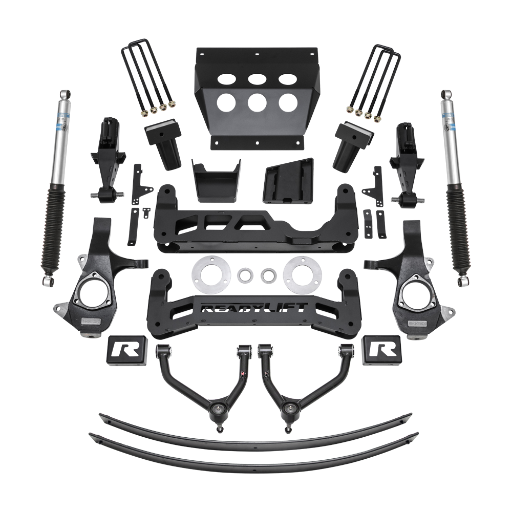 ReadyLIFT introduces a new 9-inch lift kit, the 44-3491, for 2014-2018 Chevy Silverado and GMC Sierra 1500 trucks, compatible with both standard and front MagneRide suspension systems. This kit, suitable for trucks with the factory Forged Steel front suspension, features new tubular upper control arms. It preserves the factory turning radius, minimally increases track width by less than 0.5" per side, and accommodates up to a 37" tire on a 9" wide wheel with -12 offset. The kit includes a "clam-shell" style lower strut extension that maintains the use of factory struts and avoids strut rotation. These brackets use TCT lower bushings for a precise pivot point, ensuring the factory ride quality. The new tubular upper control arms with TCT pivot bushings provide enhanced strength compared to OE stamped steel arms. The kit's front and rear cross members, as well as the full-width front skid plate, are made from robust 3/16" plate steel. It also features a 1/4-inch boxed plate steel differential drop brackets with double gusset and boxed center rib to handle front differential torsional twisting. The rear lift is achieved with a rear add-a-leaf spring and 3/16-inch thick plate steel rear lift blocks with built-in bump stop landings and an offset pin design to correctly center the axle. The lift blocks are angled to maintain proper pinion angle. Included are premium extended length Bilstein rear shocks. Note: Suitable for 2WD or 4WD models only, not AWD. It fits up to a 37" tall off-road tire with specified wheel dimensions. Minor trimming may be required for some aggressive tires. Not recommended for GMC Denali 1500 with REAR MagneRide or models with Rear MagneRide. Front MagneRide compatibility only. Comes with ReadyLIFT ReadyGuard Powertrain Warranty.