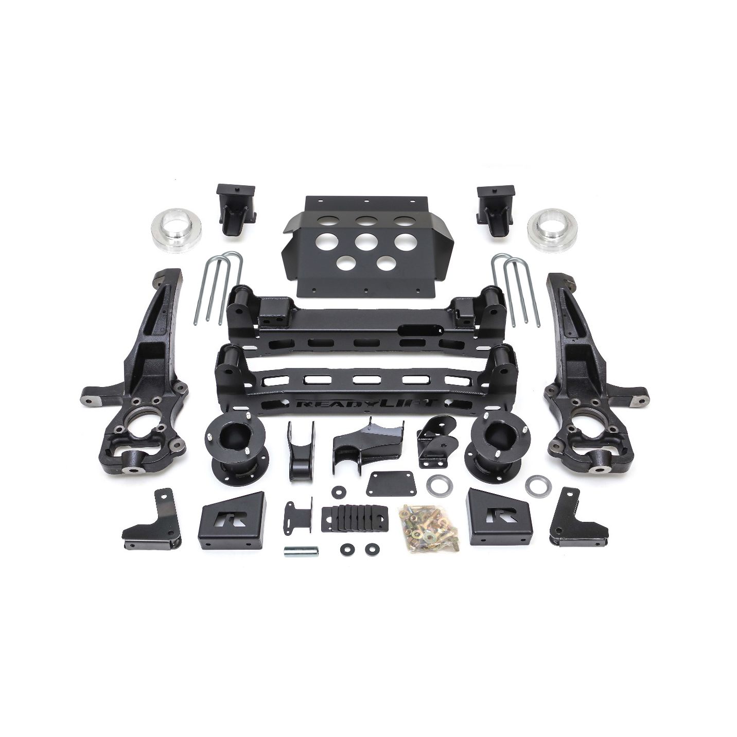 This lift kit utilizes the very best in ReadyLIFT engineering with boxed steel front/rear cross members and full-width front skid plate constructed of thick 3/16" plate steel. New 1/4-inch boxed plate steel differential drop brackets feature a double gusset and boxed center rib to take the abuse of front differential torsional twisting.Our 4" lift kit features heavy-duty angled and offset top mount strut extensions that realigns the struts to optimize shock performance and minimize wear. A specially designed lower mount strut pre-load spacer offers the added benefit of a slight increase in spring rate to better handle the larger wheels and tires that will find their way onto this new lifted truck. To lift the rear, new fabricated steel rear blocks with integrated bump stop landings have been added as well as new rear shock extensions.With months of engineering and development and more awesome features than we could possibly mention, the bottom line is this new Big Lift Kit is the best 4" lift kit you can install on a new body style 2025 GM 1500 4WD truck! Thousands of miles of road and trail testing have proven our new 4" lift kit makes these new GM 1500 trucks ride better than stock! Wheel and tire fitment information: 6" Lift Kit – Recommended max tire with no trimming: 20×9 0 offset – 35×12.50 tire. *Max with trimming: 20×10 -18 offset – 35×12.50 or 325/60R20 *Trimming requirements for larger than recommended wheel/tire include front valance, front felt liner edge, rear felt liner edge and front-rear well edge mud flap.
