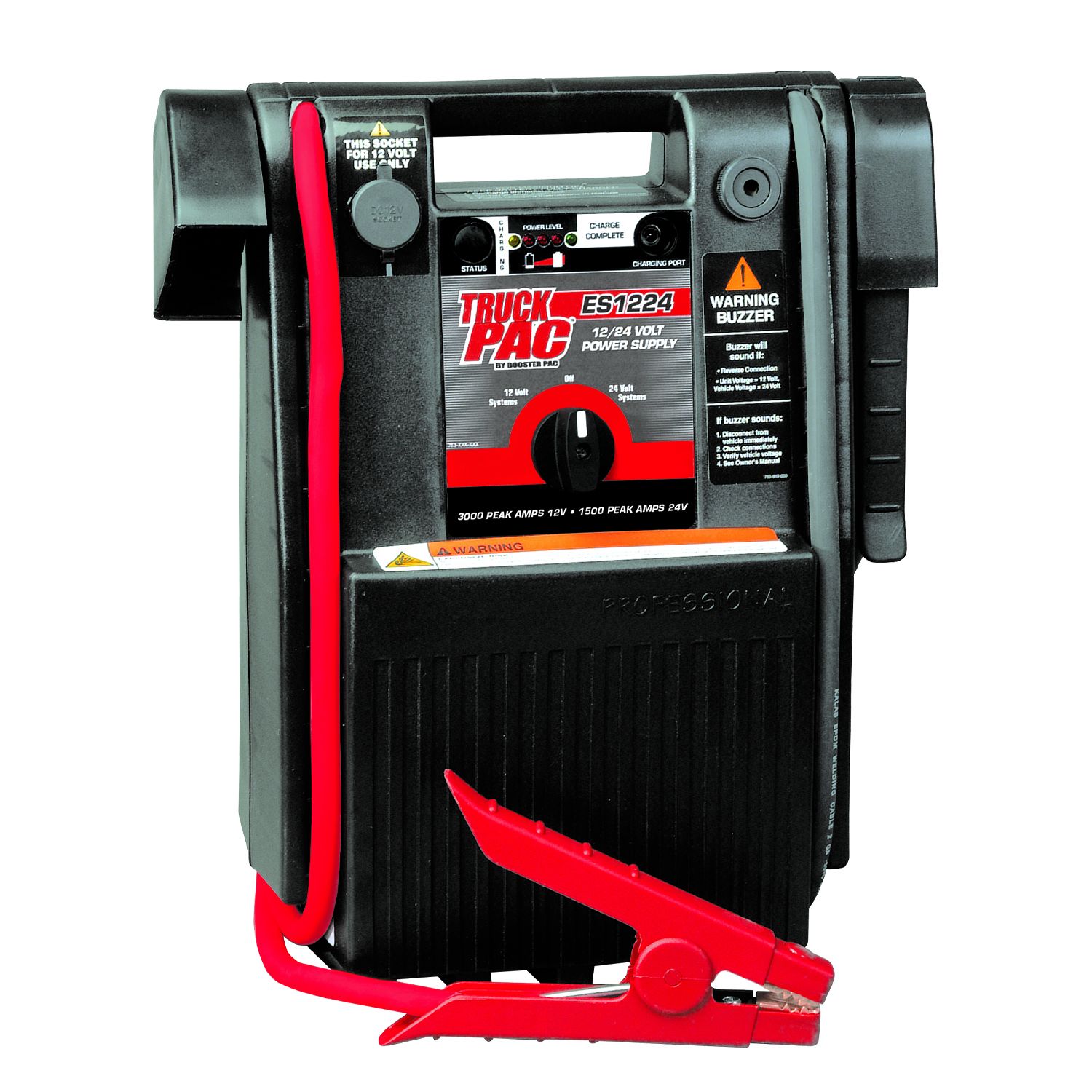Easy-to-use and versatile, the ES1224 supplies jump starting power to 12 Volt and 24 Volt vehicles. It switches from 12V to 24V operation with the turn of knob, all without sacrificing one bit of power. With 3000 Peak 12 Volt Amps and 1500 Peak 24 Volt Amps, the Truck PAC will get the job done. Its dual ES Series batteries are designed specifically for the vehicle jump starting application and deliver high output current, extended cranking power, numerous jumps per charge and a long service life. The ES1224 features automatic recharging, extra-long 60" cables and Industrial Grade Hot Jaw(tm) clamps for efficient power transfer to the vehicle. Its AWS Advanced Warning System(tm) alerts the operator to unsafe jump starting conditions, such as reverse polarity or mismatched voltages.