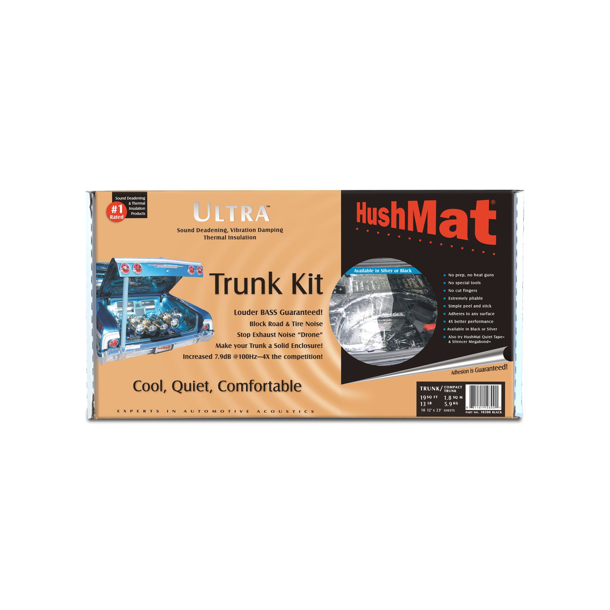 HushMat Sound Deadening and Thermal Insulating Material Trunk Kit contains ten 12 in. x 23 in. sheets of Ultra Stealth Black Foil 19 Sq Ft Stop vibrations, reduce road noise and block exhaust drone from entering the vehicle interior.