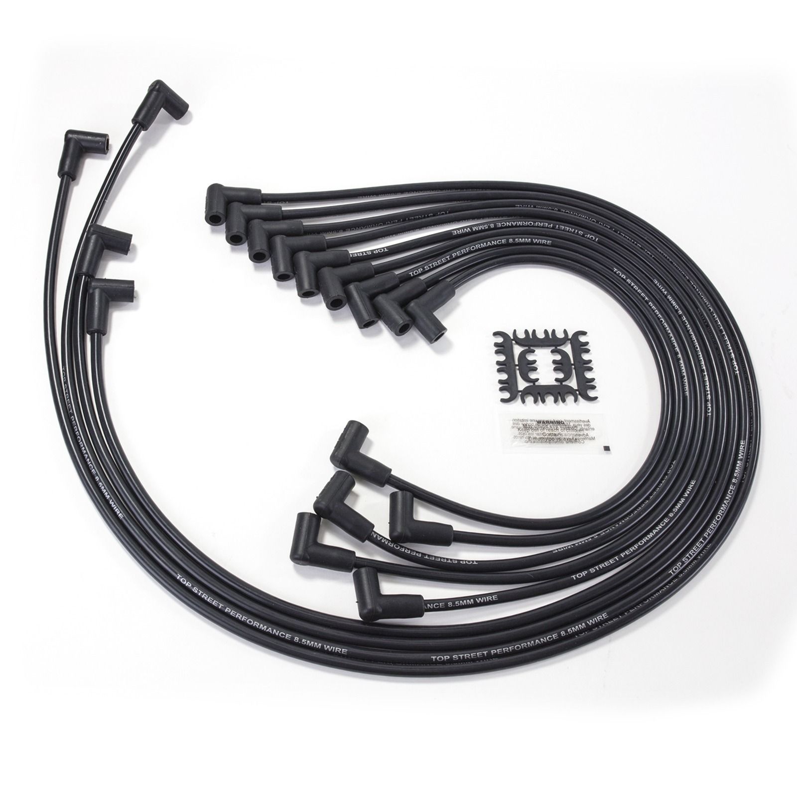 Never have burnt or melted spark plug boots again. This set of TSP wires comes equipped with premium ceramic boots, capable of withstanding temperatures up to 2,000? F. The wire itself has a jacket composed of premium, high-density silicone rated at 500? F and features a quality gloss finish to resist damage from water and chemicals. A spiral-wound Kevlar? core suppresses RFI (radio-frequency interference) and features 500 ohm per foot resistance for excellent performance. Around the core is a fiberglass braid which provides superior pull strength. This set is pre-cut and assembled for Chevy small block engines.