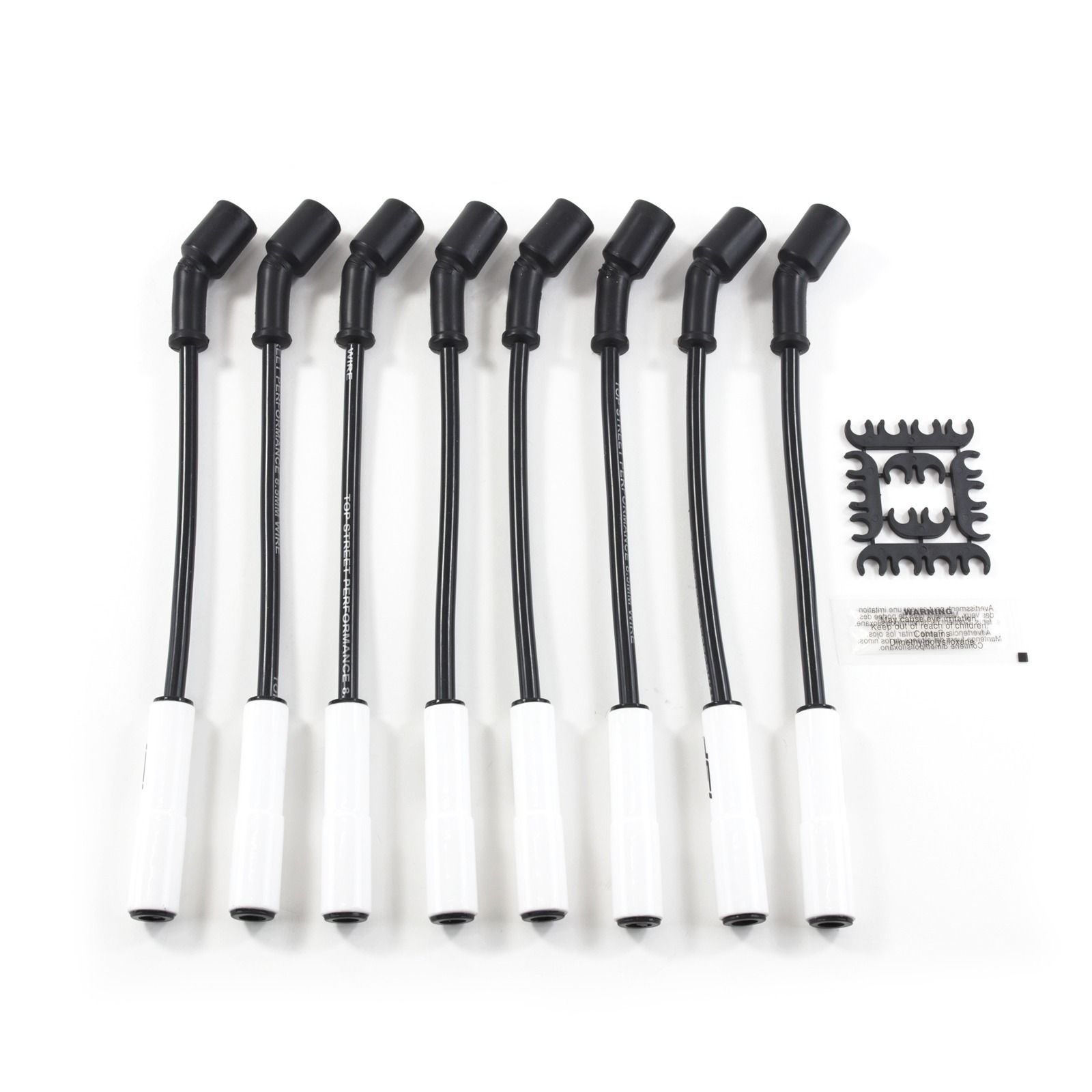 Never have burnt or melted spark plug boots again. This set of TSP wires comes equipped with premium ceramic boots, capable of withstanding temperatures up to 2,000? F. The wire itself has a jacket composed of premium, high-density silicone rated at 500? F and features a quality gloss finish to resist damage from water and chemicals. A spiral-wound Kevlar? core suppresses RFI (radio-frequency interference) and features 500 ohm per foot resistance for excellent performance. Around the core is a fiberglass braid which provides superior pull strength. This set is not assembled but comes with LS-style terminals for a universal fit.