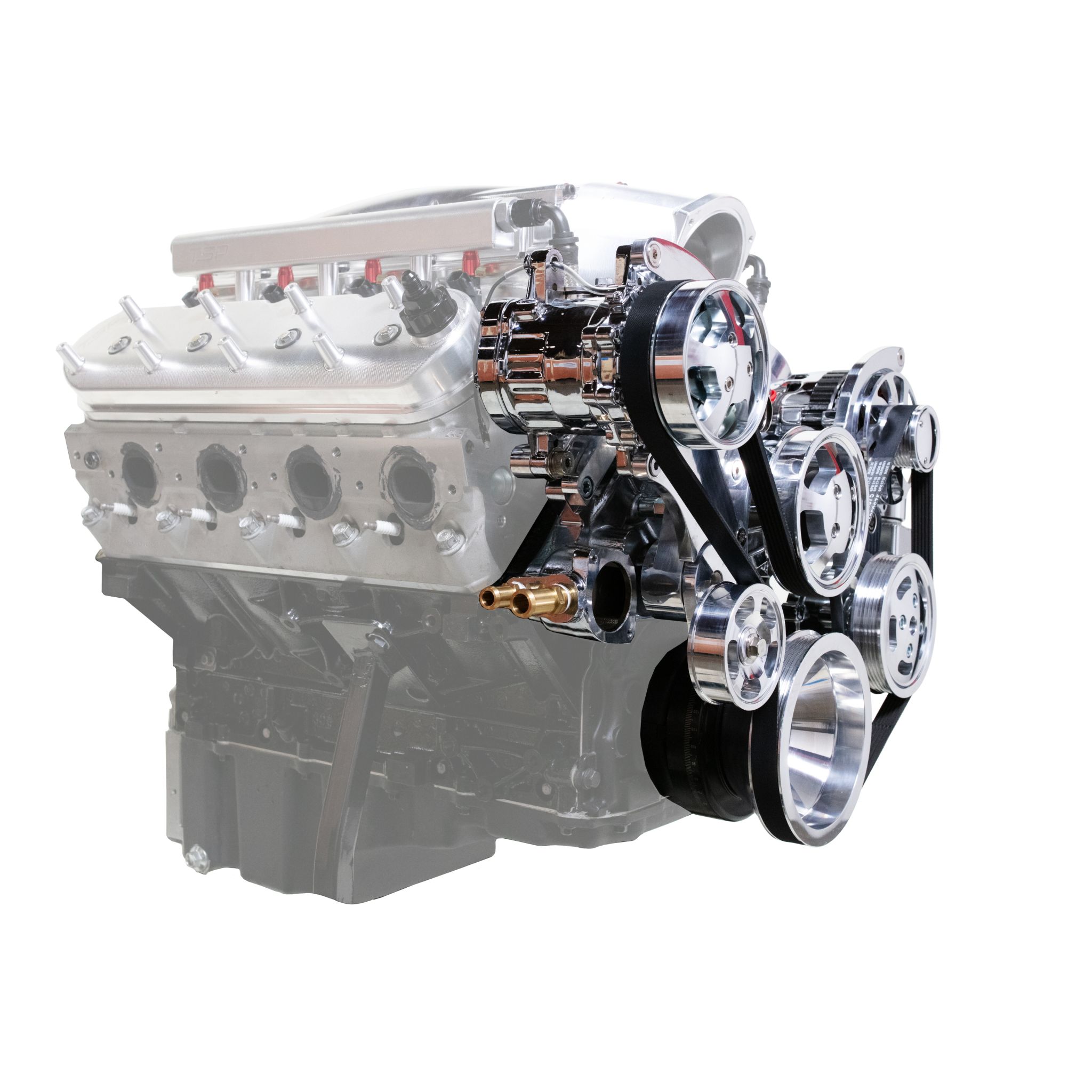 TSP's LS Serpentine Front Drive System is finally here. Designed for performance and style, it's sure to turn heads. If you're looking for a way to dress up your LS swap, look no further. And the best part: this kit comes with everything you need. This set comes with billet aluminum brackets and pulleys, a high-amp alternator, a/c compressor, water pump, and GM type II power steering pump with an integral 14 oz fabricated aluminum reservoir. It's available in black and polished finishes to complete any look.
