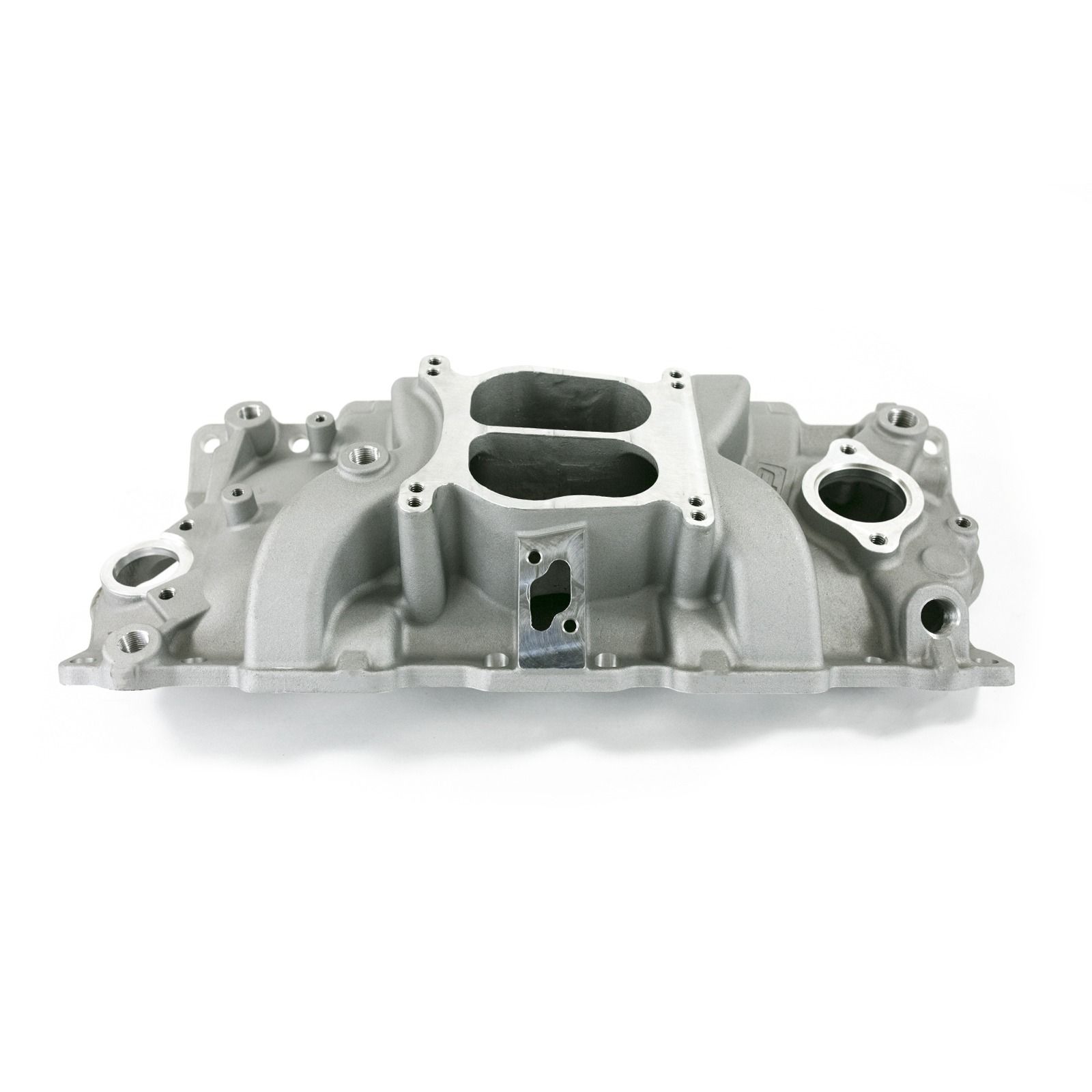 TSP's dual-plane high-performance intake manifold for the small block Chevy is ideal for street performance applications. With a design that improves throttle response, as well as power and torque over a wide rpm range – idle to 5,500. It is cast from lightweight aluminum and features a low profile for ideal hood clearance. Additional provisions include dual distributor hold-downs, 4 corner water ports, and a choke block-off kit. Set up for spread bore carbs, this manifold comes with an adapter plate and gasket for use with square bore types.