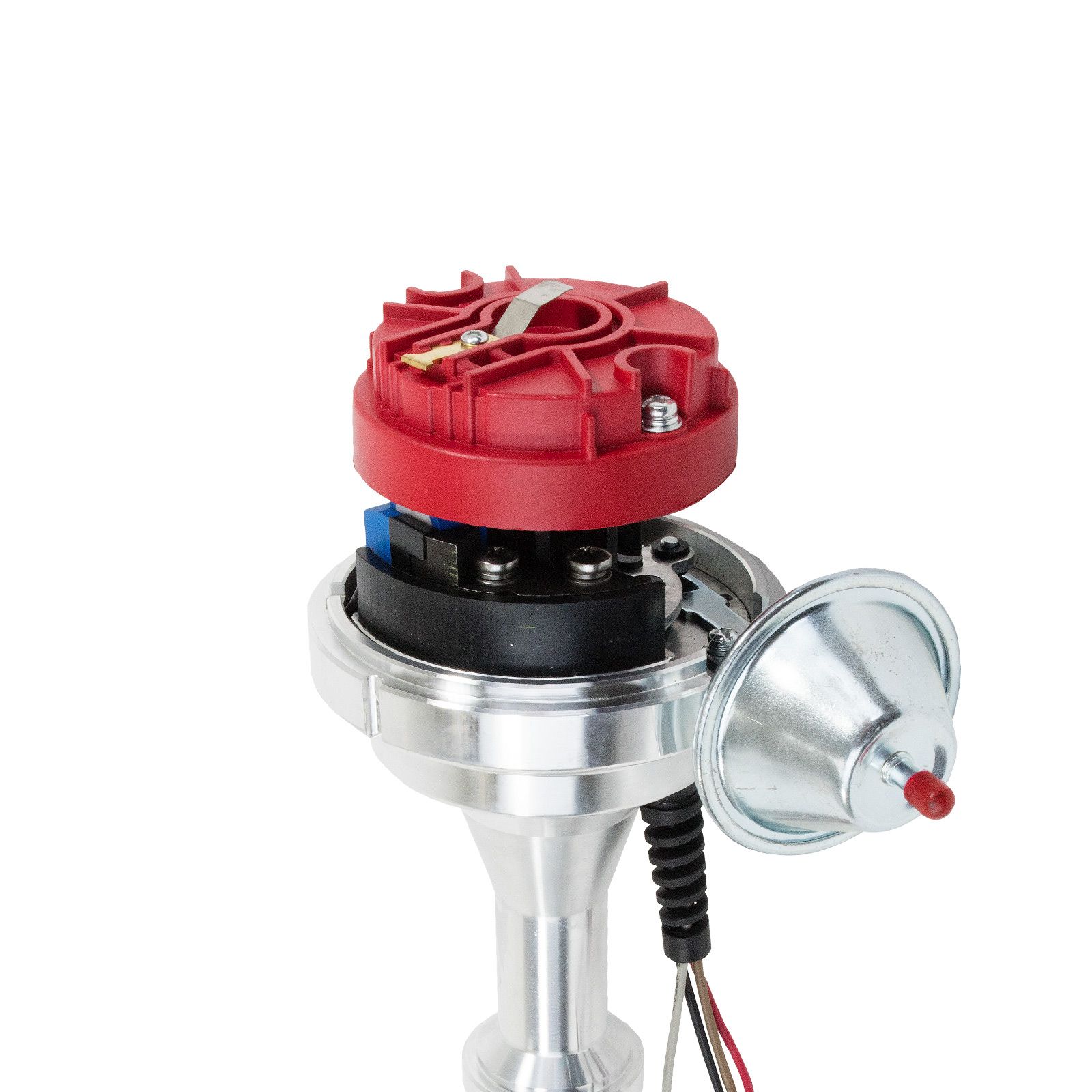 TSP Pro Series Ready to Run Distributor is perfect for a street performance upgrade. It features a CNC-machined billet aluminum body and hardened steel shaft, with a sealed ball bearing on top and a sintered steel bushing on the bottom. It also comes with a fully adjustable mechanical advance, vacuum advance, magnetic pickup trigger, and a high-output circuit board module with digital tach output. The dielectric cap comes with solid brass terminals and a color-matched wire retainer.
