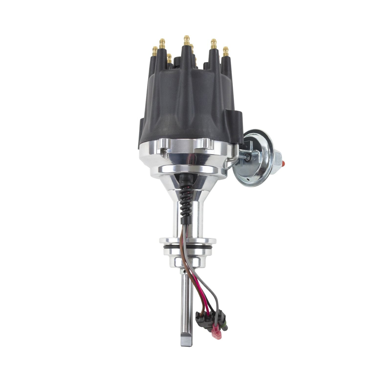 TSP Pro Series Ready to Run Distributor is perfect for a street performance upgrade. It features a CNC-machined billet aluminum body and hardened steel shaft, with a sealed ball bearing on top and a sintered steel bushing on the bottom. It also comes with a fully adjustable mechanical advance, vacuum advance, magnetic pickup trigger, and a high-output circuit board module with digital tach output. The dielectric cap comes with solid brass terminals and a color-matched wire retainer.
