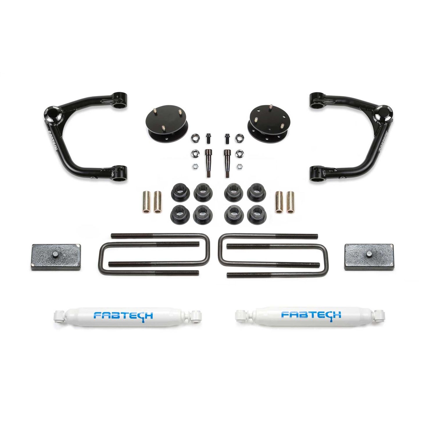 Fabtech's Upper Control Arm system provides a 3.5 in. increased ride height over stock without creating suspension bind at full droop. Lift is accomplished with steel spacers that utilize the factory coilover shocks for a smooth ride. The heavy duty Uniball Upper Control Arms are constructed of the finest material with .120 in. wall 1.50 in. OD 4130 Chromoly tubing. High quality 1 in. FK Stainless PTFE lined Uniball bearings are utilized in place of ball joints. These super stout Control Arms are designed for increased longevity in rugged offroad conditions while providing a more positive on road feel. Rear lift comes from 1.5 in. blocks and u-bolts.