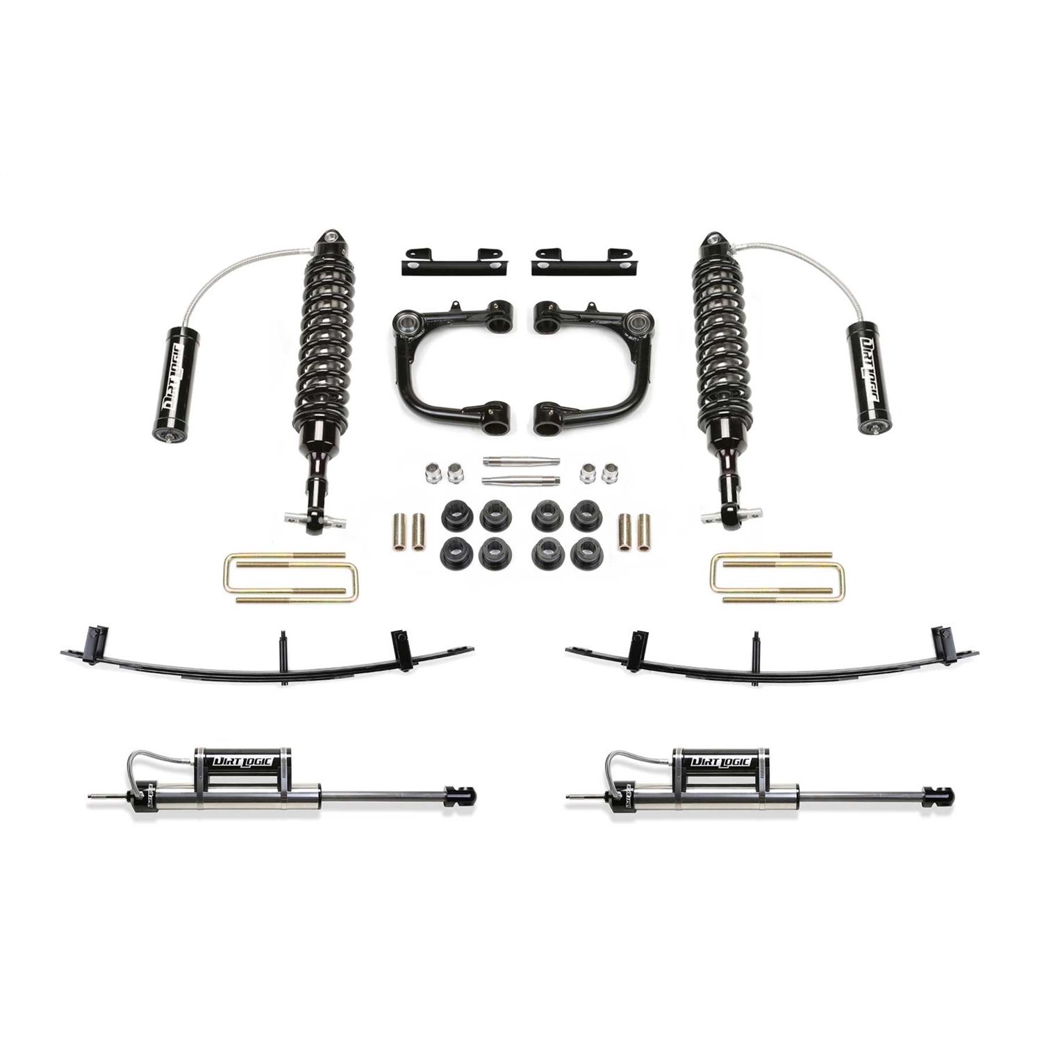 Obtain increased wheel travel and mild lift height with this heavy duty Upper Control Arm system. The tubular Upper Control Arms feature 1.25 OD. .120 wall thick chromoly tube construction with 1 diameter Stainless Steel Uniballs that attach to the factory spindle without drilling. These heavy duty UCAs have been designed to work in conjunction with Fabtechs legendary Dirt Logic 2.5 Coilover shocks for a complete front suspension system upgrade. The F150s offroad suspension performance will be greatly enhanced due to the extensive ride tuning of the stainless steel Dirt Logic 2.5 Coilovers and rear Dirt Logic 2.25s.