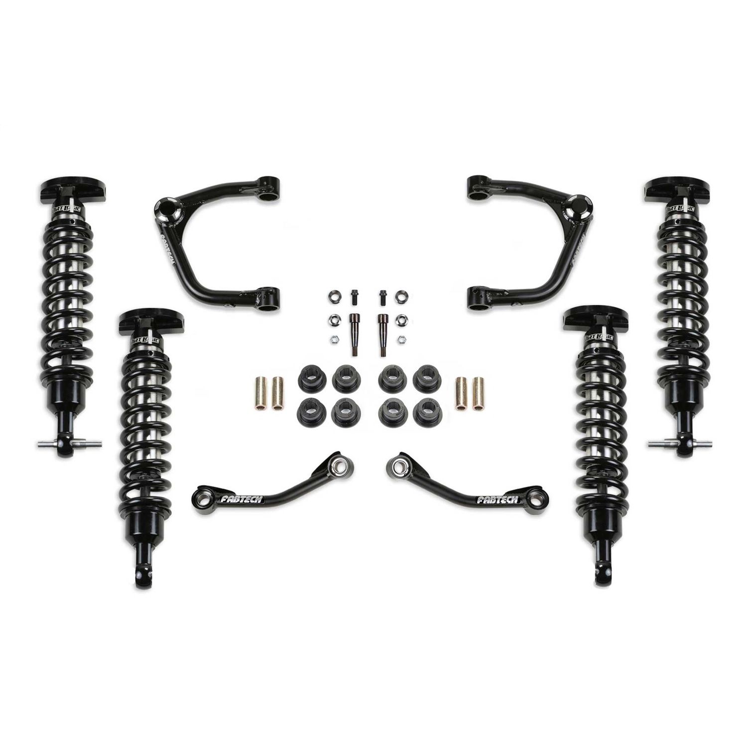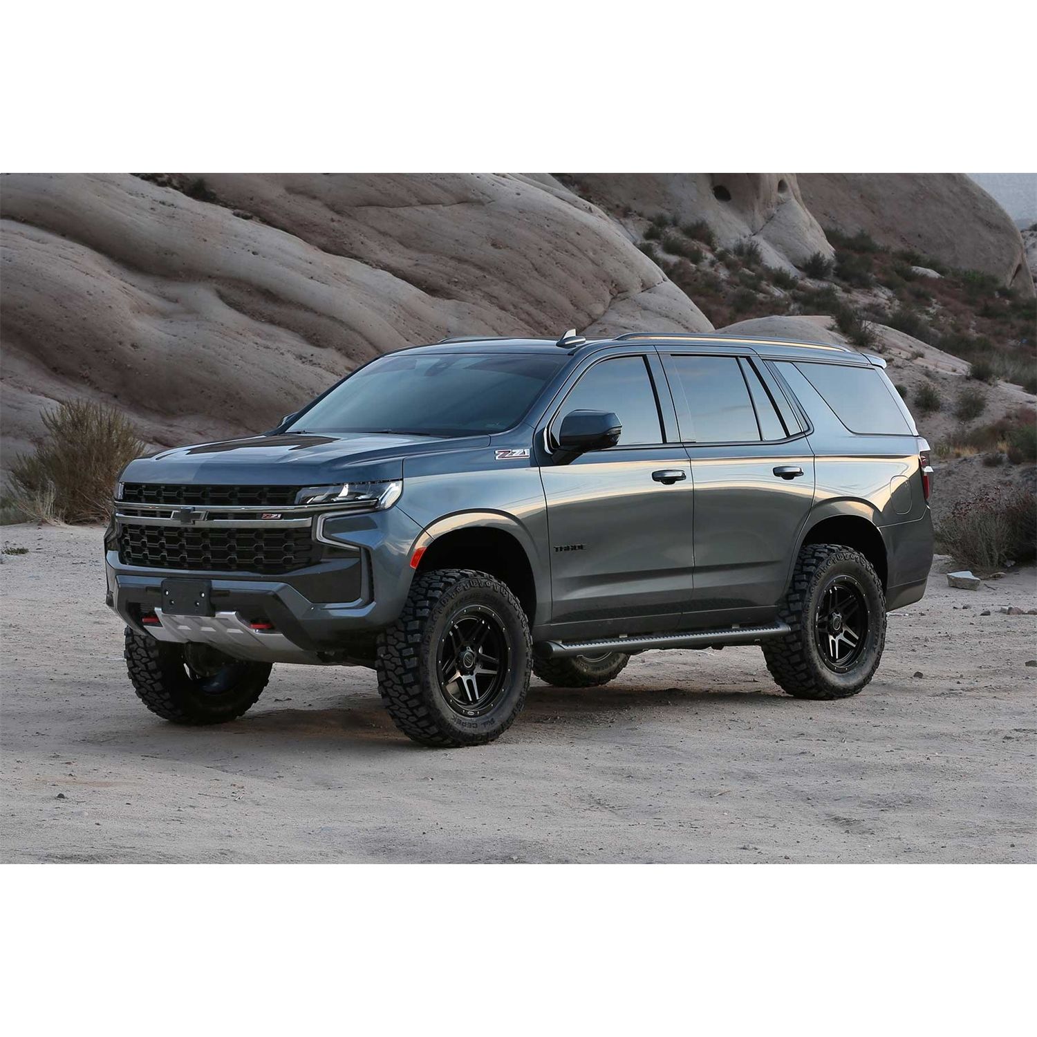 This high quality suspension has been designed to upgrade GM 1500 SUV's with standard suspension for increased strength and a balanced compliant ride for both on and offroad. The front suspension receives Fabtech's heavy duty Uniball Upper Control Arms and Dirt Logic 2.5 Coilover shocks. The Fabtech arms are vastly superior to the stock arms providing strength and longevity to the vehicle. They are constructed of 1.25 in. OD, .120 in. wall chromoly tubing with 1 in. FK Stainless PTFE lined Uniballs that attach to the factory GM steering knuckle without drilling. The replacement UCA's have been designed to work in conjunction with Fabtech's Stainless Steel Dirt Logic 2.5 Coilover shocks for a complete front suspension system upgrade. The Dirt Logic 2.5 Coilovers feature cold wound coil springs for a smooth ride with the ability to tackle aggressive offroad terrain. The rear receives extended length upper link arms to allow for increased travel without bind. The geometry of these links provides the proper alignment to the rear independent suspension with the new ride height. As with the front, the rear also receives stainless steel Dirt Logic 2.5 Coilover shocks for a superior ride quality. This 3 in. lift kit system is perfect for those that want increased suspension performance with a low lift height. A great choice for daily drivers that overland and hit the trails on weekends.