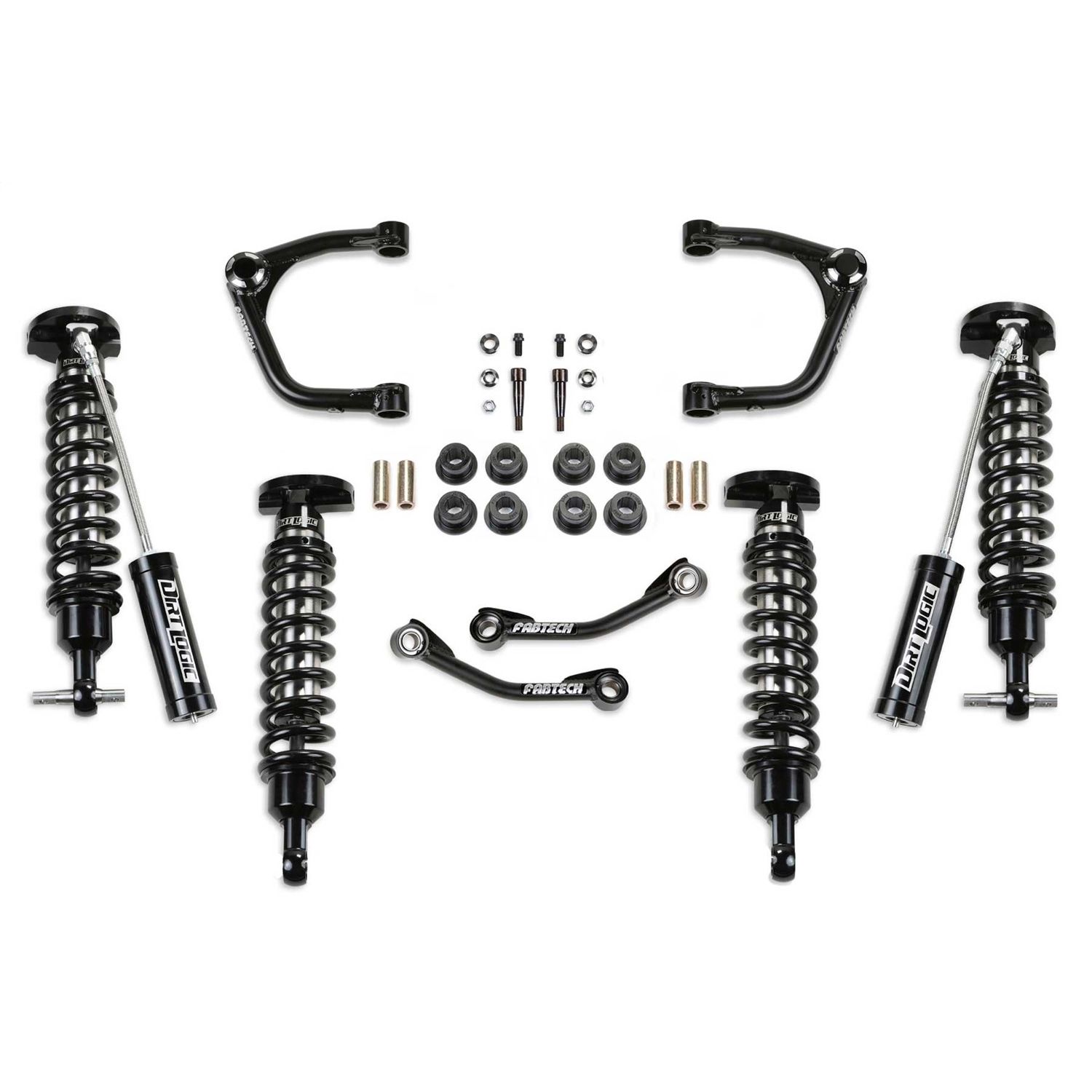 This high quality suspension has been designed to upgrade GM 1500 SUV's with standard suspension for increased strength and a balanced compliant ride for both on and offroad. The front suspension receives Fabtech's heavy duty Uniball Upper Control Arms and Dirt Logic 2.5 Coilover shocks. The Fabtech arms are vastly superior to the stock arms providing strength and longevity to the vehicle. They are constructed of 1.25 in. OD, .120 in. wall chromoly tubing with 1 in. FK Stainless PTFE lined Uniballs that attach to the factory GM steering knuckle without drilling. The replacement UCA's have been designed to work in conjunction with Fabtech's Stainless Steel Dirt Logic 2.5 Coilover shocks for a complete front suspension system upgrade. The Dirt Logic 2.5 Coilovers feature cold wound coil springs for a smooth ride with the ability to tackle aggressive offroad terrain. The rear receives extended length upper link arms to allow for increased travel without bind. The geometry of these links provides the proper alignment to the rear independent suspension with the new ride height. As with the front, the rear also receives stainless steel Dirt Logic 2.5 Coilover shocks for a superior ride quality. This 3 in. lift kit system is perfect for those that want increased suspension performance with a low lift height. A great choice for daily drivers that overland and hit the trails on weekends.