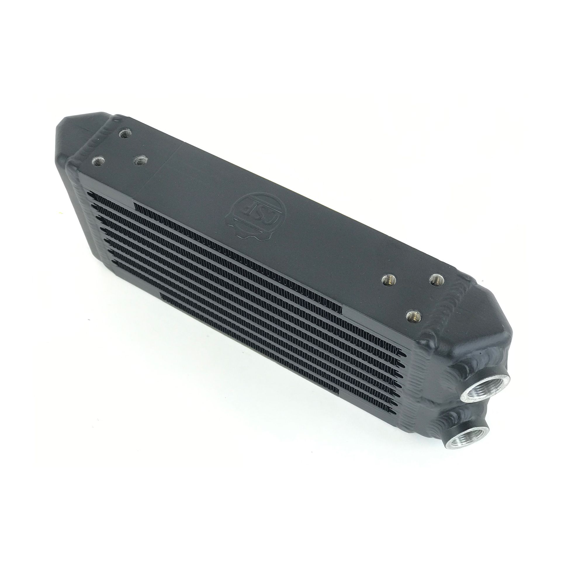 The unique design of CSF's oil cooler line has distinct advantages over conventional style oil coolers (plate-type/stacked oil coolers). The oil coolers can be placed in tighter spaces or different areas of the vehicle that don't have much vertical surface area. Longer rectangular sizes can also help with avoiding the stacking of too many coolers which may cause airflow issues to other components in the cooling system. Inlet/outlet port placement is much easier to route oil lines. Typical oil cooler lines have to be routed from different/opposite ends of the cooler often facing up or down. Usually one line has to run across from one side of the cooler to the other to then be routed together to the feed/return connection of the oil system. The CSF oil coolers are much more robust, durable, and can withstand a higher peak burst rate. This allows the cooler to be mounted in areas that might get high debris (front fascia, diff cooler, side vents, etc…). The CSF oil cooler is designed to withstand a tremendous amount of vibration and debris.
