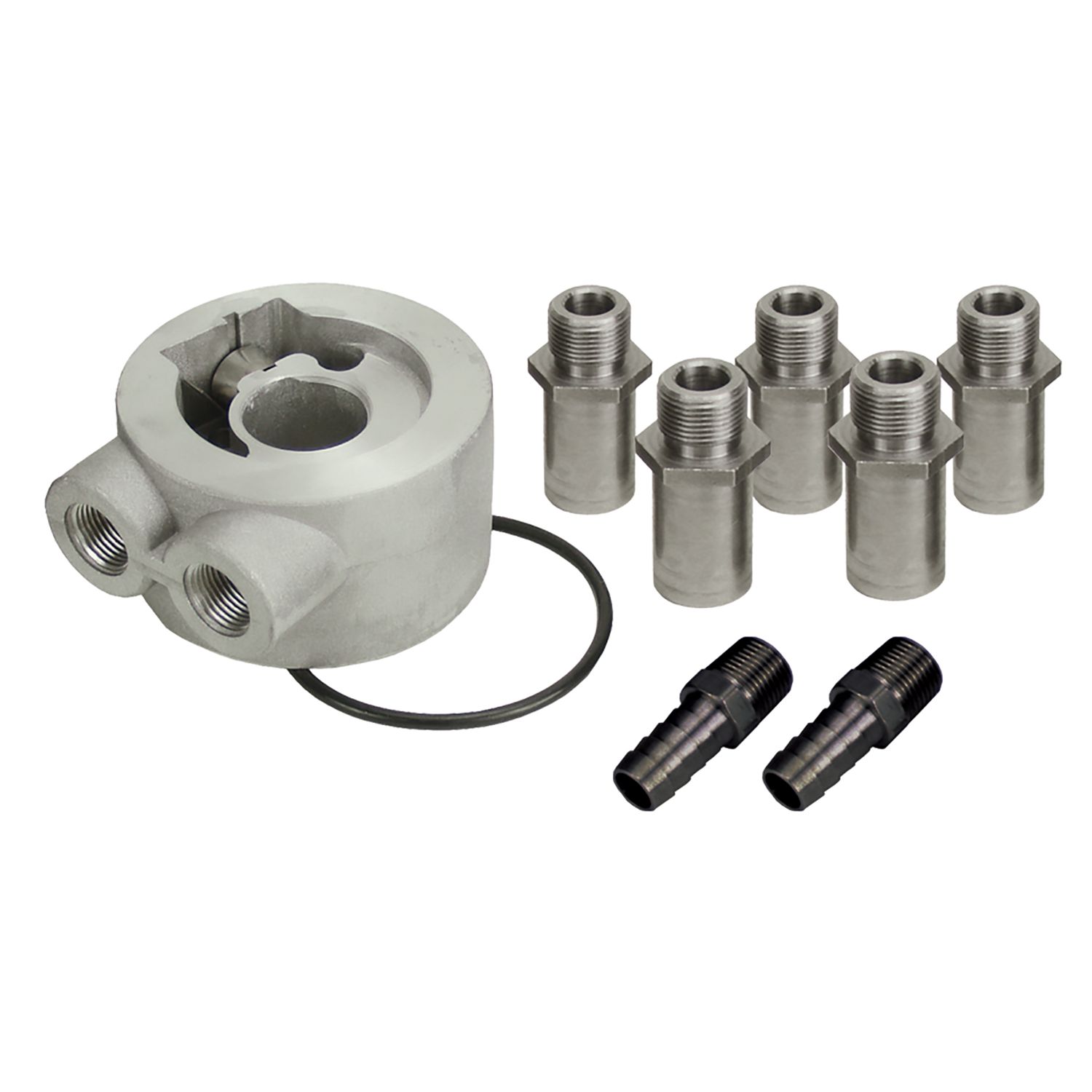 This universal kit is manufactured of high-quality die-cast aluminum and includes an 180°F thermostatic sandwich adapter with 3/8" NPT ports and an O-ring diameter of 2 3/4". A sandwich adapter provides external oil lines to allow the addition of an engine oil cooler. It installs between the stock engine oil filter landing and the oil filter. Kit includes sleeve nuts and hose barb fittings.