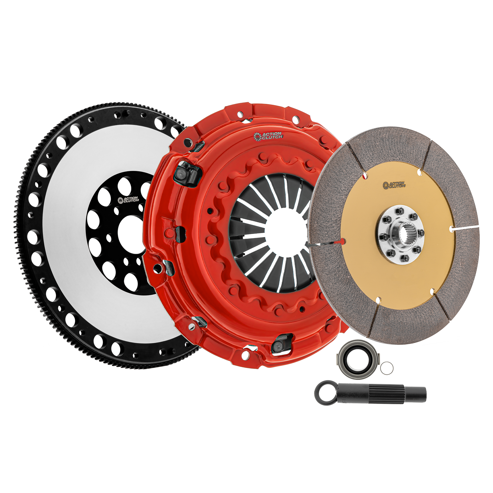 The Action Clutch Ironman Unsprung kit is engineered specifically for dedicated high powered race vehicles, delivering durability and reliable performance. It features our American Sintered Iron friction material with our Dual clamp load heavy-duty pressure plate that ensures maximum torque holding capacity. The clutch engagement is aggressive with an on/off feel, without introducing clutch chatter. Some light engagement noise and gear rattle may be experienced during operation due to the nature of the product. No compromises are made in this kit, ensuring optimal performance even under extreme conditions. This kit is not intended for street use and should only be used in race applications. At Action Clutch, every kit is quality checked by one of our experienced engineers (with over 60 years of collective experience) and signed off as safe before being released as a finished product. This gives you peace of mind knowing that your Action Clutch will perform consistently every time. NOTE: Purchasing the wrong type of clutch kit for your specific engine power output can result in premature clutch failure, damage to the transmission and void warranty eligibility. If you're unsure what kit is right for you, contact Action Clutch direct. 250% INCREASED HOLDING CAPACITY OVER FACTORY KIT SPECIFICALLY ENGINEERED FOR TRACK USE APPLICATIONS ONLY