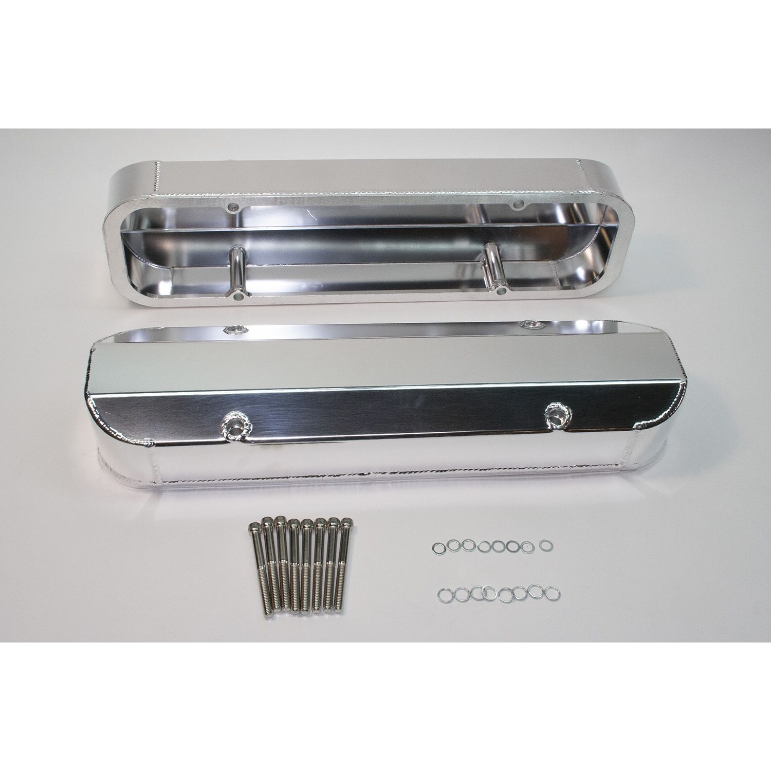 Valve Cover Set, Aluminum, Fabricated Billet Rail, Short Design, 3mm Thick Top Plate, Polished Clear Anodized.