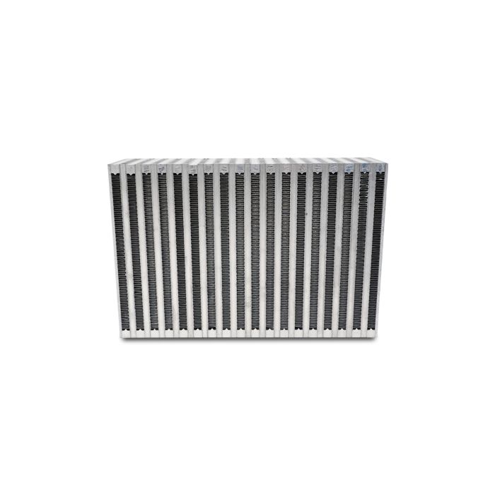 Vibrant Performance Vertical Flow Air to Air Intercooler Cores feature Bar and Plate construction and a unique louvered fin design on the ambient path that maximizes the core's available surface area, and an offset fin design on the charge path allows for minimal pressure loss.