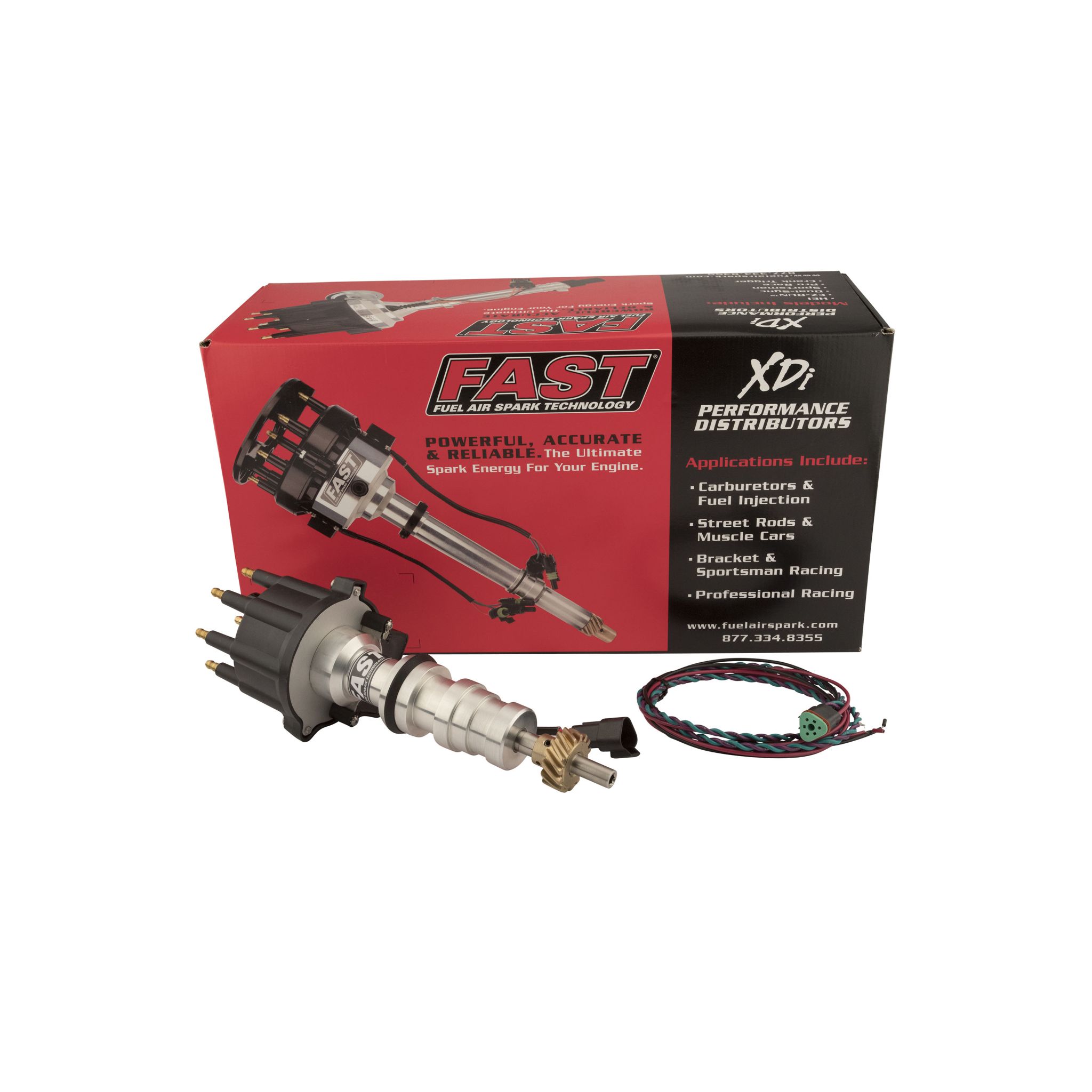 The FAST XDi Sportsman Distributors were designed to deliver the most accurate trigger signal possible throughout the entire RPM range of your race engine. This is accomplished through the use of an advanced Hall-effect style pickup which is then converted to a signal that most CD ignition controls accept. The benefit of a Hall-effect pickup is there is no retard, commonly called magnetic pickup compensation, so you can ensure your timing remains stable from idle to race RPM. Inside the CNC-machined billet housing is a polished stainless steel shaft that is supported with sealed ball bearing on the top and a long bushing on the bottom. FAST also has gone through great strides to reduce end play in the distributor to take out any timing variations and damage to the gear. Each distributor is supplied with a high-quality rotor and distributor cap. A FAST Ignition Control (E6 or E7 series) must be used. Note that there is no mechanical advance, the timing is locked out. XDi Sportsman Distributors are available with a large diameter Ford style cap or smaller diameter GM points size cap with HEI terminals.
