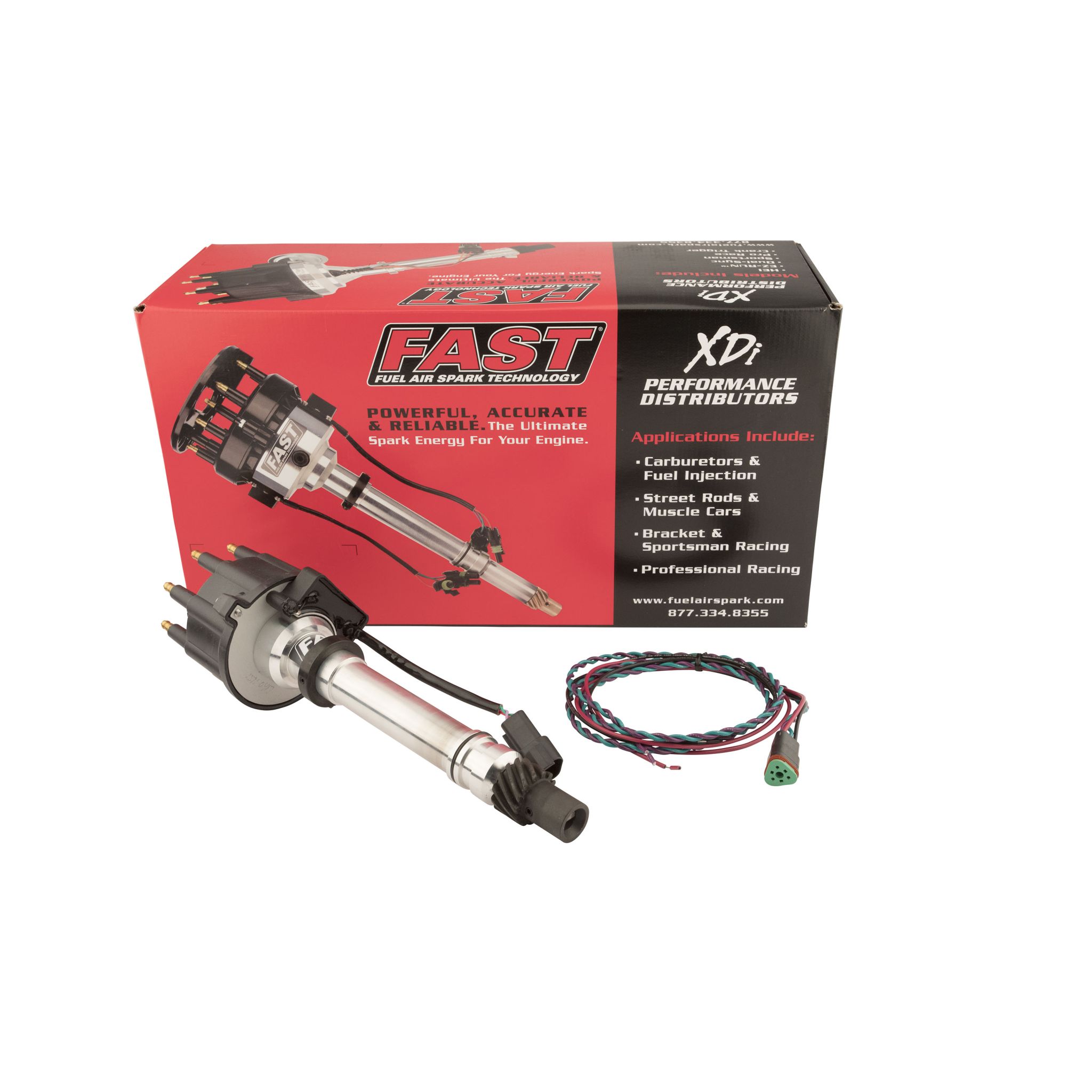 The FAST XDi Sportsman Distributors were designed to deliver the most accurate trigger signal possible throughout the entire RPM range of your race engine. This is accomplished through the use of an advanced Hall-effect style pickup which is then converted to a signal that most CD ignition controls accept. The benefit of a Hall-effect pickup is there is no retard, commonly called magnetic pickup compensation, so you can ensure your timing remains stable from idle to race RPM. Inside the CNC-machined billet housing is a polished stainless steel shaft that is supported with sealed ball bearing on the top and a long bushing on the bottom. FAST also has gone through great strides to reduce end play in the distributor to take out any timing variations and damage to the gear. Each distributor is supplied with a high-quality rotor and distributor cap. A FAST Ignition Control (E6 or E7 series) must be used. Note that there is no mechanical advance, the timing is locked out. XDi Sportsman Distributors are available with a large diameter Ford style cap or smaller diameter GM points size cap with HEI terminals.