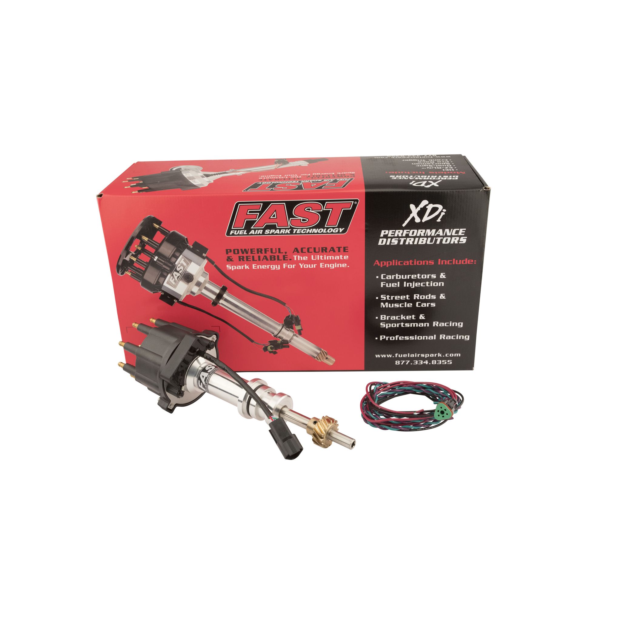 The FAST XDi Sportsman Distributors were designed to deliver the most accurate trigger signal possible throughout the entire RPM range of your race engine. This is accomplished through the use of an advanced Hall-effect style pickup which is then converted to a signal that most CD ignition controls accept. The benefit of a Hall-effect pickup is there is no retard, commonly called magnetic pickup compensation, so you can ensure your timing remains stable from idle to race RPM. Inside the CNC-machined billet housing is a polished stainless steel shaft that is supported with sealed ball bearing on the top and a long bushing on the bottom. FAST also has gone through great strides to reduce end play in the distributor to take out any timing variations and damage to the gear. Each distributor is supplied with a high-quality rotor and distributor cap. A FAST Ignition Control (E6 or E7 series) must be used. Note that there is no mechanical advance, the timing is locked out. XDi Sportsman Distributors are available with a large diameter Ford style cap or smaller diameter GM points size cap with HEI terminals.