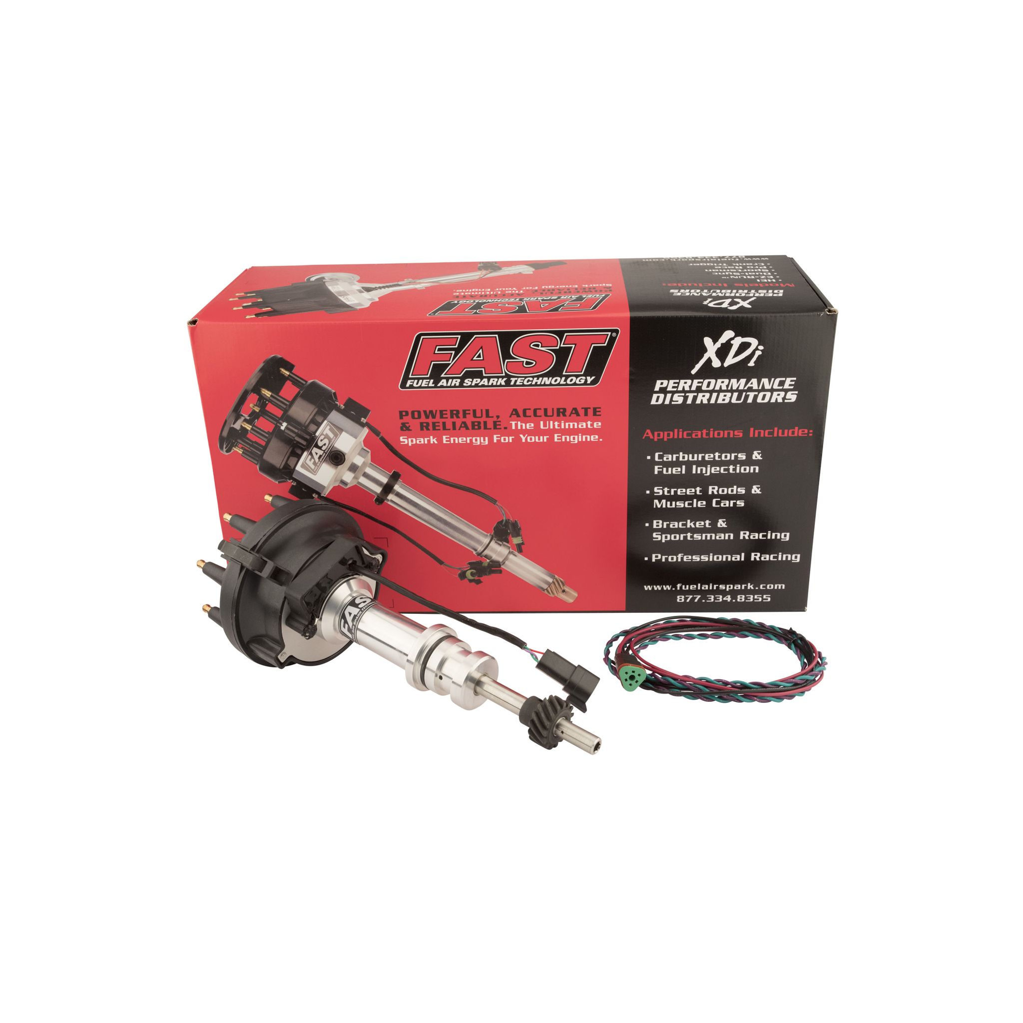 The FAST XDi Sportsman Distributors were designed to deliver the most accurate trigger signal possible throughout the entire RPM range of your race engine. This is accomplished through the use of an advanced Hall-effect style pickup which is then converted to a signal that most CD ignition controls accept. The benefit of a Hall-effect pickup is there is no retard, commonly called magnetic pickup compensation, so you can ensure your timing remains stable from idle to race RPM. Inside the CNC-machined billet housing is a polished stainless steel shaft that is supported with sealed ball bearing on the top and a long bushing on the bottom. FAST also has gone through great strides to reduce end play in the distributor to take out any timing variations and damage to the gear. Each distributor is supplied with a high-quality rotor and distributor cap. A FAST Ignition Control (E6 or E7 series) must be used. Note that there is no mechanical advance, the timing is locked out. XDi Sportsman Distributors are available with a large diameter Ford style cap or smaller diameter GM points size cap with HEI terminals.