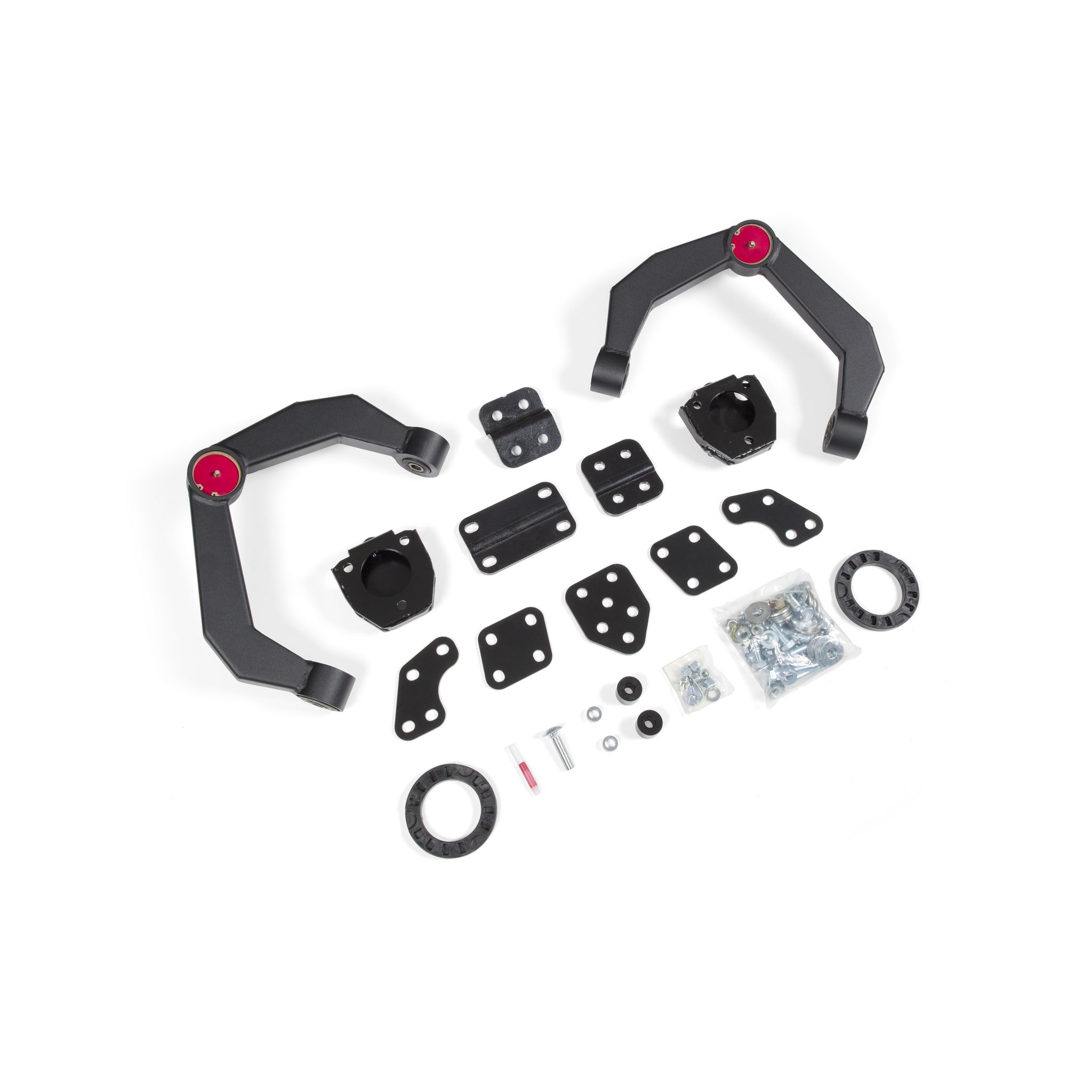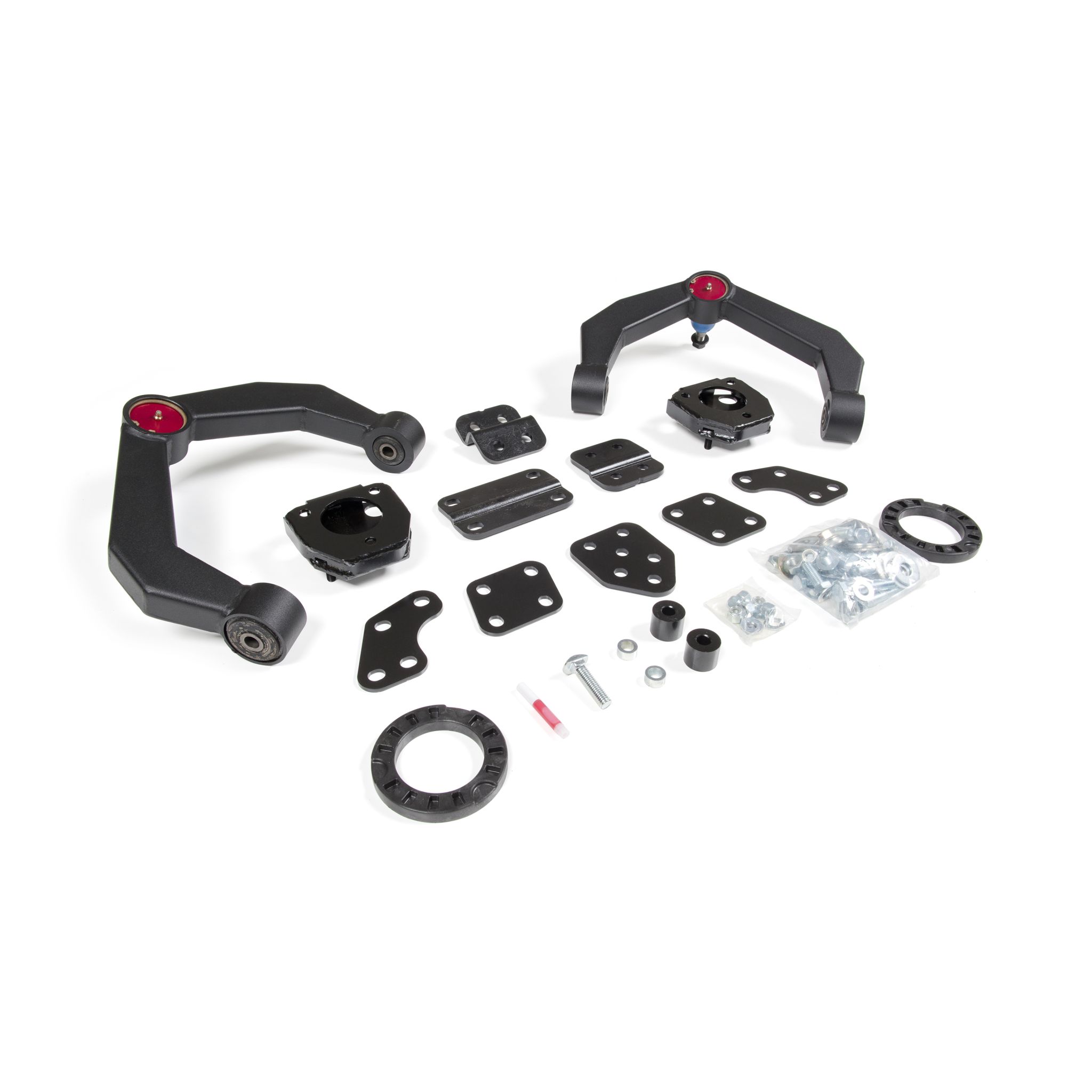 Level out your RAM 1500 the right way with Zone Offroad. In addition to these steel fabricated top mounted strut spacers and preload spacers designed for 2.5" of lift, these kits address the limitations of the factory upper ball joint (maxed out with a leveling kit installed which will lead to premature wear) by upgrading to adventure series upper control arms (UCAs). These fully boxed and welded UCAs offer superior strength and performance and use an indexed ball joint cup designed for more droop travel. Also included are differential relocation brackets to correct CV operating angles.