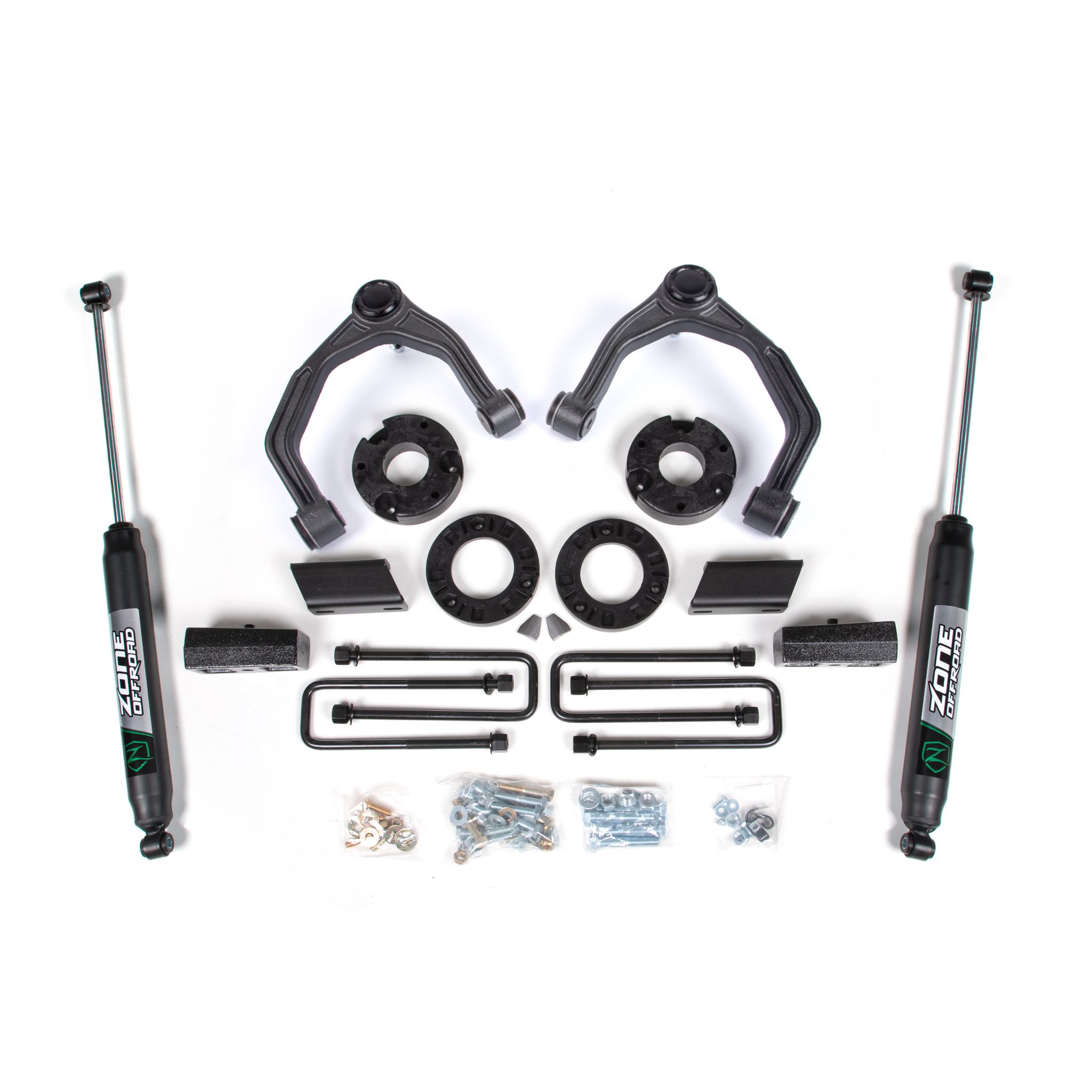 More than a leveling kit, this 3.5" Adventure Series kit takes advantage of Adventure Series upper control arms to offer improved performance and off-road capability with clearance for up to 35" tires. These high strength UCAs allow for increased suspension travel, improved strength and durability, and easy maintenance. Lift is provided by a 2-piece, combination top-mount and preload strut spacers design to provide a full 3.5" of lift without overextending the suspension at full droop (as is the case with kits using just a top mounted spacer). Optional weld-in steering stops are supplied allowing clearance for up to 35" tires. In the rear of this kit, a cast 2" lift block lifts and levels.