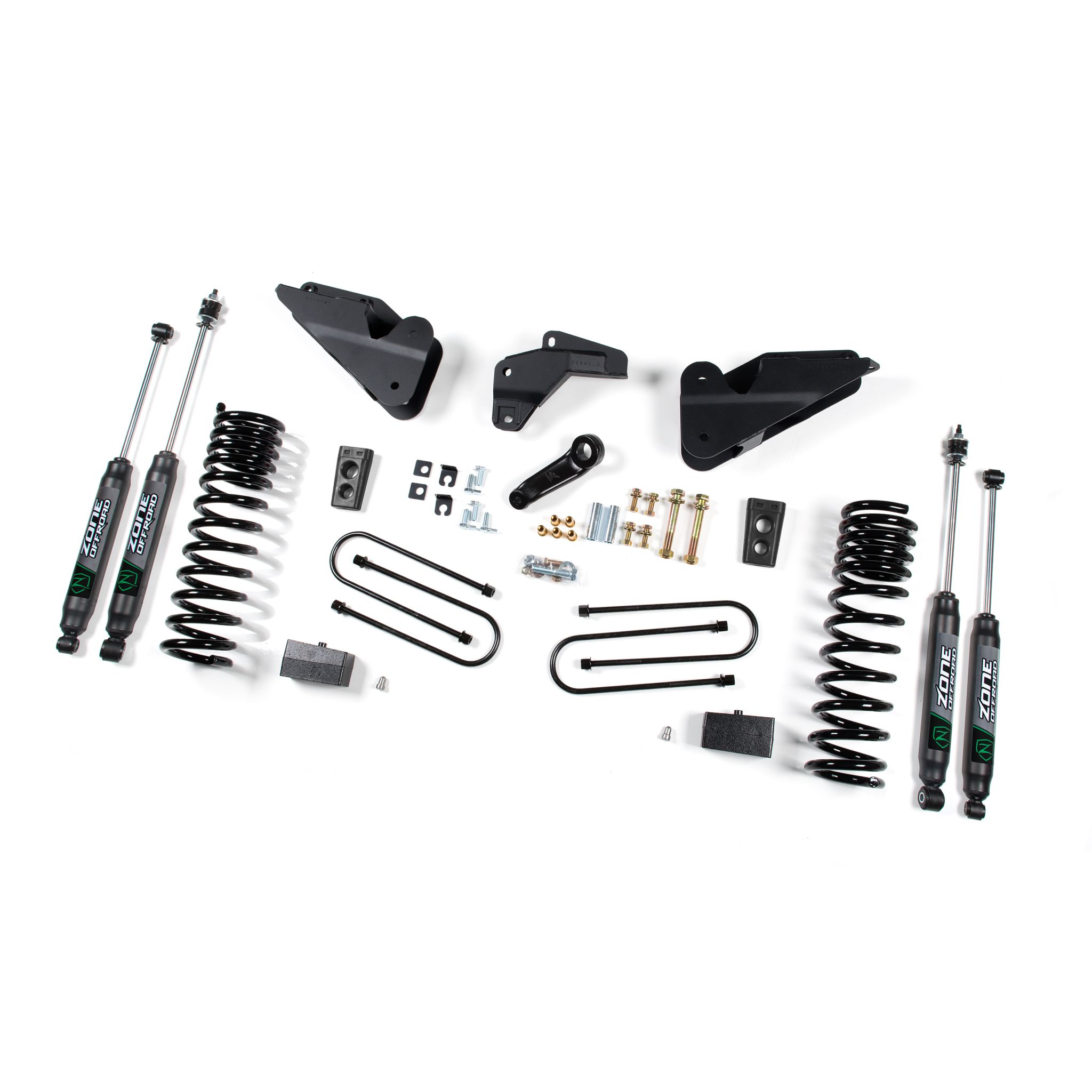 Take your RAM 3500 to new heights with this 4.5" lift kit from Zone Offroad. Kits include everything needed from full length coil springs and stout radius arm relocation brackets to steering correction and rear lift to level the stance. Get the look, performance, and capability your truck deserves with clearance for up to 37" tires.