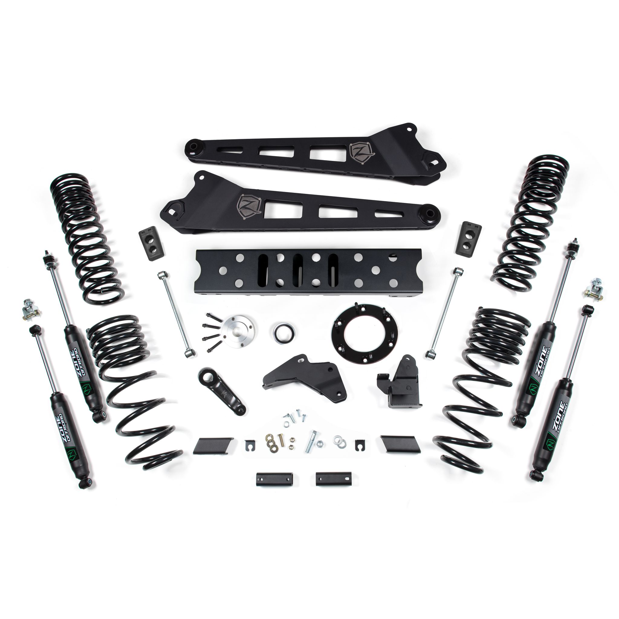 Take your RAM 2500 to new heights with this 6.5" radius arm lift kit from Zone Offroad. Kits include everything needed from full length coil springs and heavy duty radius arms to steering correction and rear lift to level the stance. Get the look, performance, and capability your truck deserves with clearance for up to 37" tires.