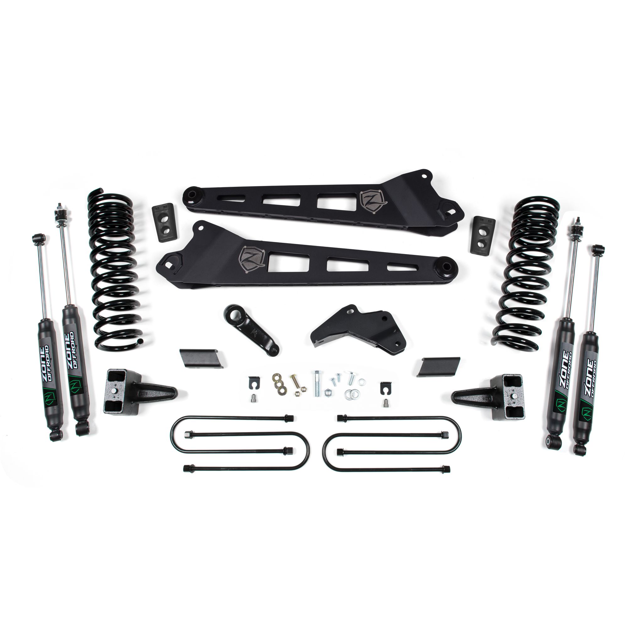 Take your RAM 3500 to new heights with this 5.5" lift kit from Zone Offroad. Kits include everything needed from full length coil springs and stout radius arms to steering correction and rear lift to level the stance. Get the look, performance, and capability your truck deserves with clearance for up to 37" tires.