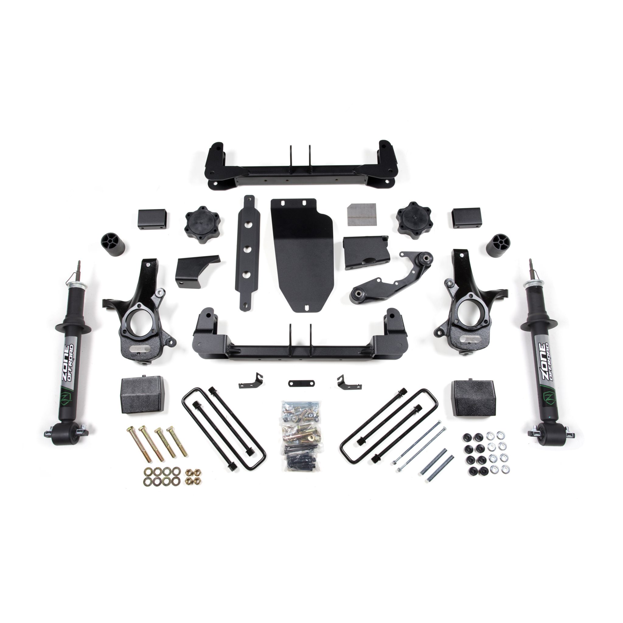 Take your Silverado/Sierra 1500 to new heights with this 6.5" lift kit from Zone Offroad. Kits include everything needed from high strength crossmembers, skid plates and steering knuckles to Nitro series gas struts for improved performance with a lifted and leveled out stance. Get the look, performance, and capability your truck deserves with clearance for up to 35" tires.
