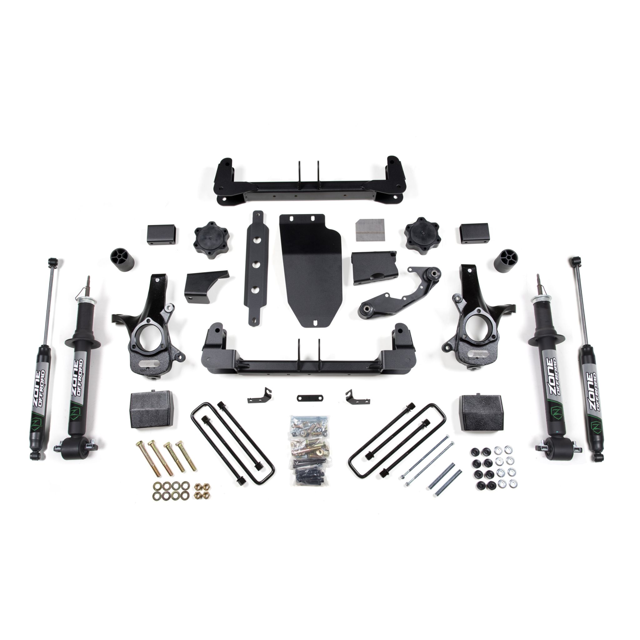 Take your Silverado/Sierra 1500 to new heights with this 6.5" lift kit from Zone Offroad. Kits include everything needed from high strength crossmembers, skid plates and steering knuckles to Nitro series gas struts for improved performance with a lifted and leveled out stance. Get the look, performance, and capability your truck deserves with clearance for up to 35" tires.