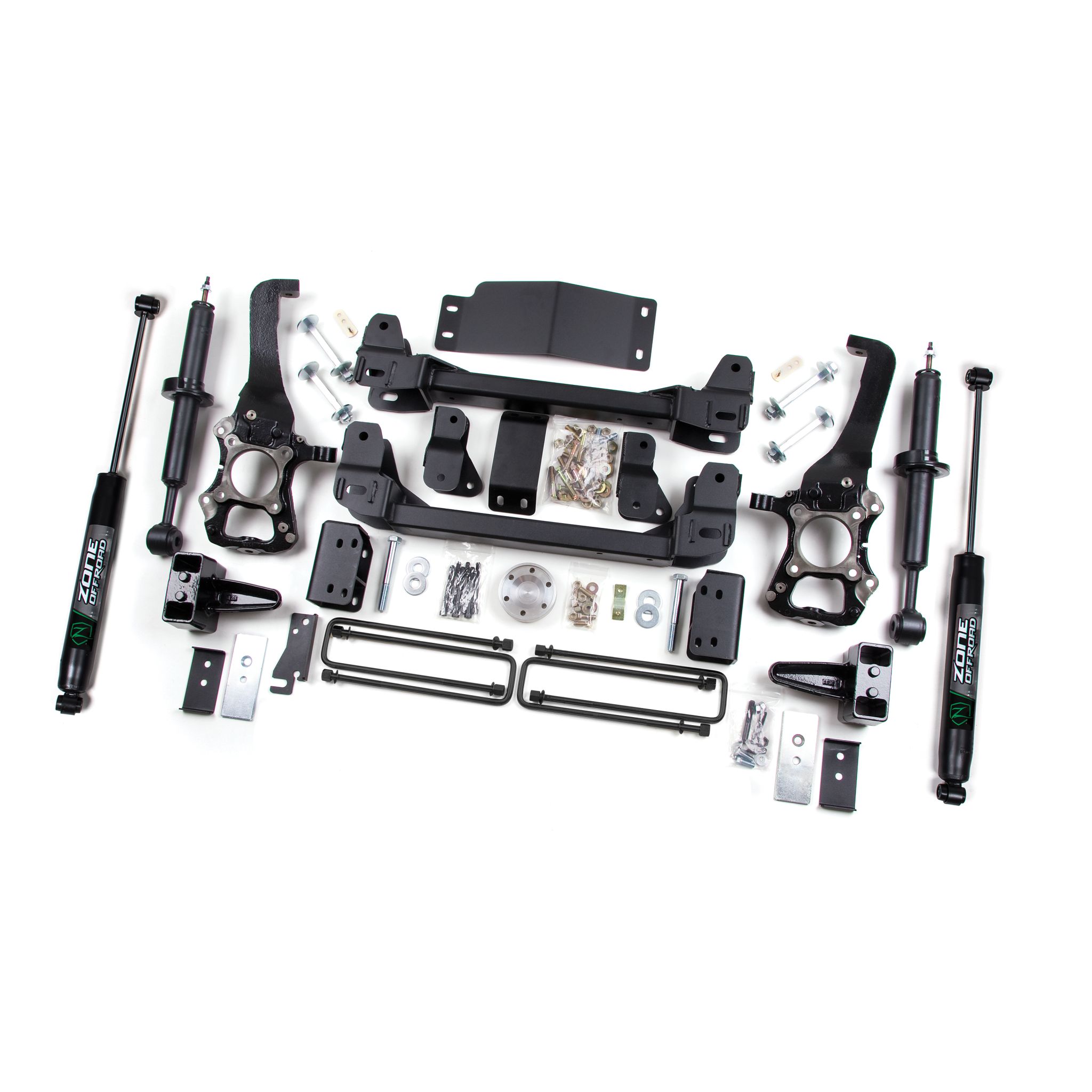 Take your F150 to new heights with this 6" lift kit from Zone Offroad. Kits include everything needed from high strength crossmembers and steering knuckles to strut spacers and rear a block kit to level out the stance. Get the look, performance, and capability your truck deserves with clearance for up to 37" tires.