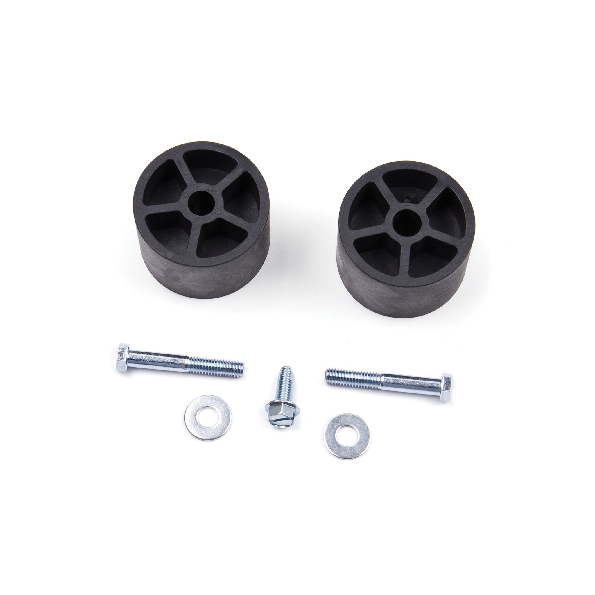 This bump stop extension kit includes a pair extensions that attach with a 3/8" bolt to create a universal mounting platform very common on Jeeps as well as many other vehicles. Bump stop extensions limit a tire's upward travel into the fender well, limiting spring travel to prevent failure and fatigue by keeping the spring from being over-compressed on lifted vehicles – especially those with larger-than-stock tires.