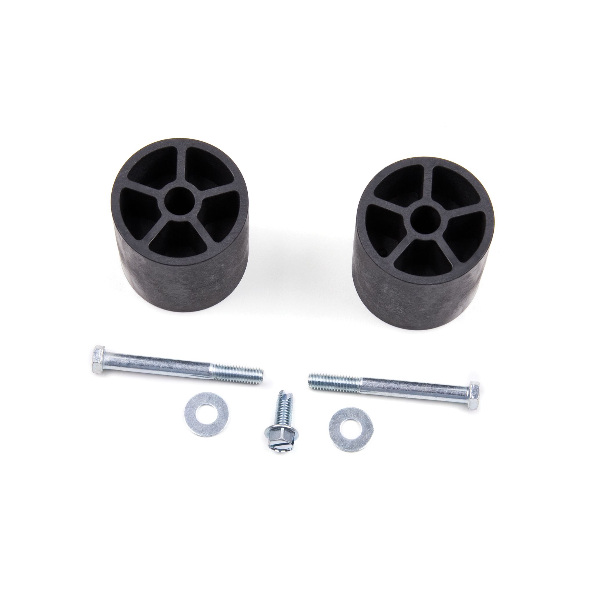 This bump stop extension kit includes a pair extensions that attach with a 3/8" bolt to create a universal mounting platform very common on Jeeps as well as many other vehicles. Bump stop extensions limit a tire's upward travel into the fender well, limiting spring travel to prevent failure and fatigue by keeping the spring from being over-compressed on lifted vehicles – especially those with larger-than-stock tires.