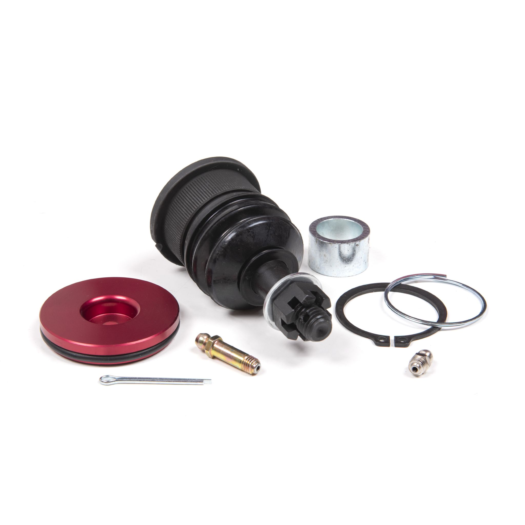 Kits include (1) press-in ball joint, snap ring, grease zerk, cotter pin, gasket and new red anodized dust cap to service (1) control arm