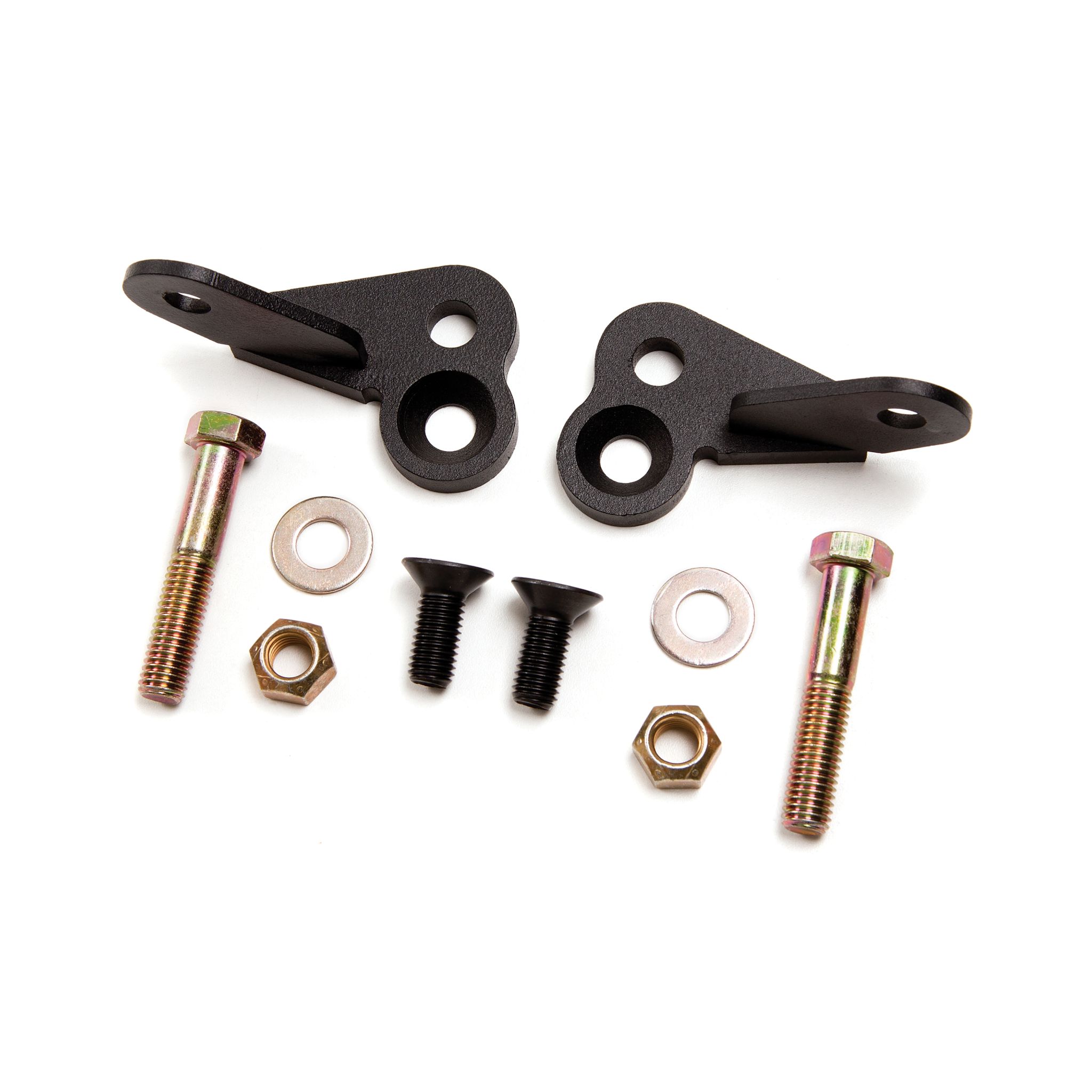 These shock extensions are designed for Dodge Ram 1500 trucks fitted with leveling kits to allow full suspension travel with the factory shocks installed. These relocation brackets simply install to the lower control arm and allow additional droop travel to keep from limiting movement so you can get the most out of your leveled Dodge.